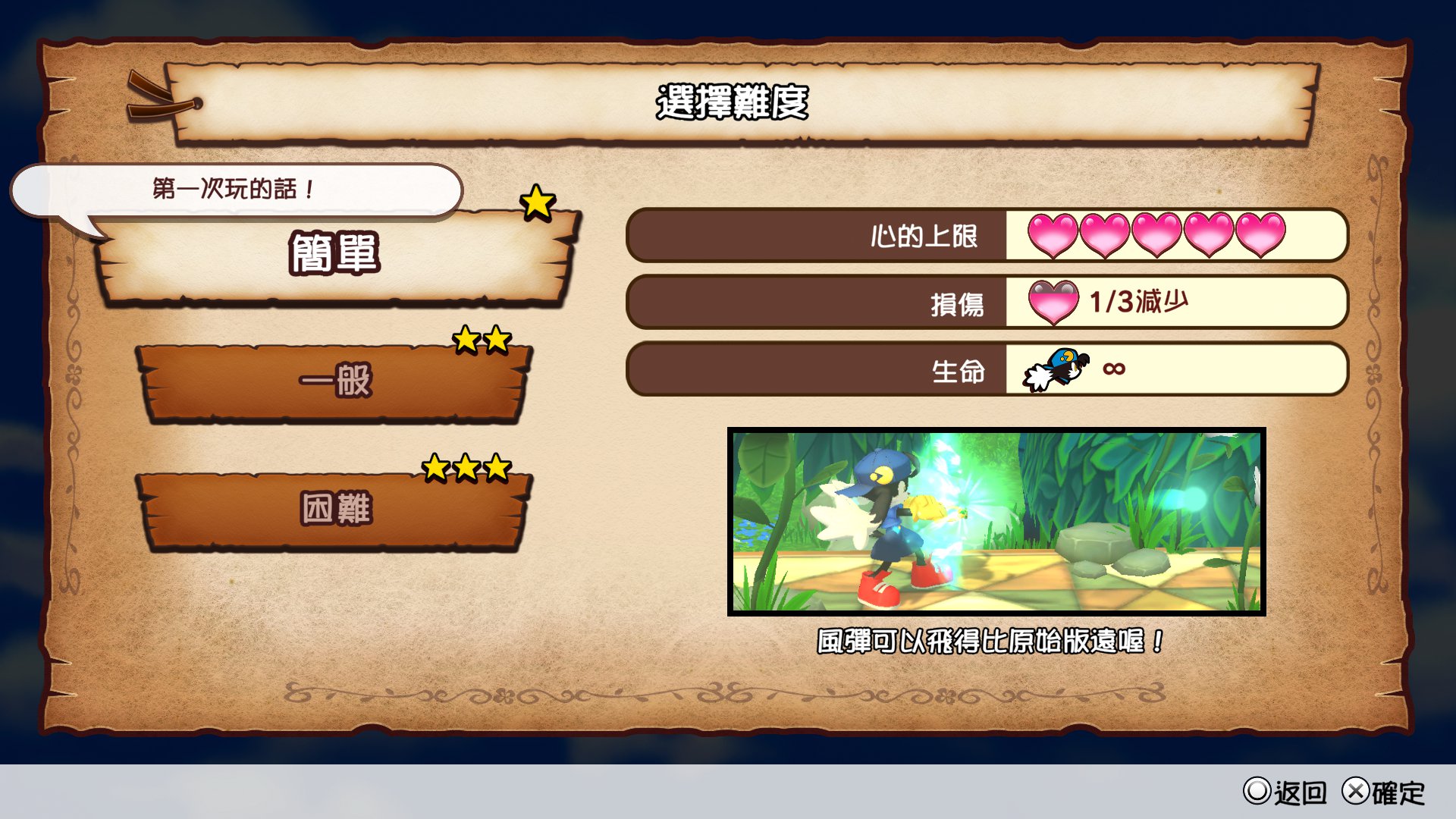 玩家可自「簡單」、「一般」及「困難」三個難度中選擇。依據不同難度,風彈距離、損傷數及敵人造成的損傷皆有所不同,也可於遊玩途中變更關卡難度。困難難度將於主劇情破關後出現(以簡單或一般模式破關皆可)。