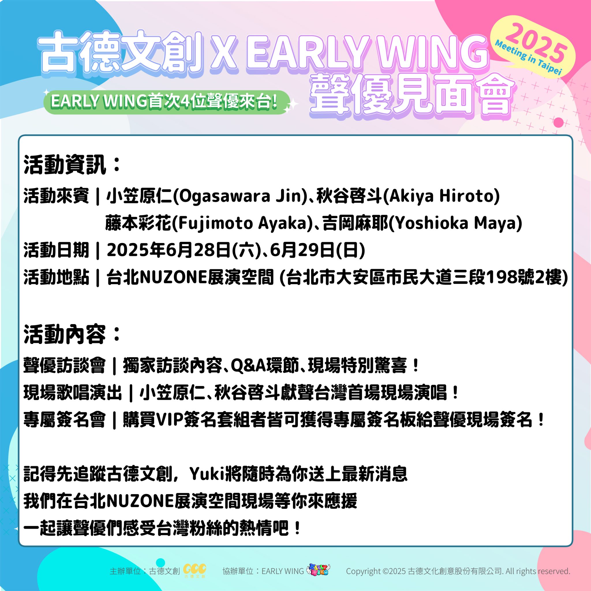 日本聲優事務所 EARLY WING 首度以事務所形式來台。由古德文創主辦,「古德文創 X EARLY WING 2025 meeting in Taipei」將於 2025 年 6 月 28 日、29 日於台北 NUZONE 展演空間舉行。邀請四位新生代聲優,小笠原仁、秋谷啓斗、藤本彩花、吉岡麻耶舉辦粉絲見面會,與台灣粉絲面對面互動,還有專屬簽名會以及首次在台公開演唱。VIP 簽名套組現已在 KKTIX 平台與全台全家便利商店 FamiPort 開賣中。