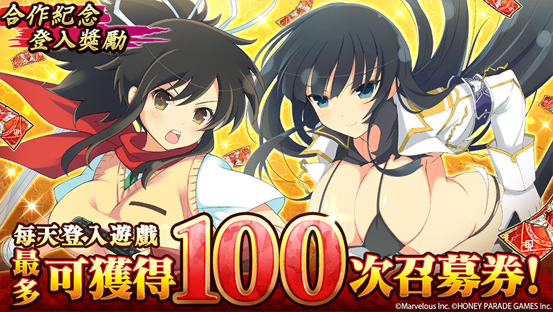 透過登入獎勵可獲得「半藏學院召募券」,使用「半藏學院召募券」執行的 5 連召募中,「[命駆の決意] 飛鳥」與「[飛燕抜刀] 斑鳩」兩位合作角色的召募機率將被提升,每天登入遊戲就可獲得最多 100 連召募的召募券。合作召募「暴英雄祭」同步召開,身著遊戲內武將服裝的合作角色將會登場。身著「劉備」服裝的「飛鳥」以及身著「曹操」服裝的雪泉」等召募機率將大幅提昇。