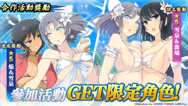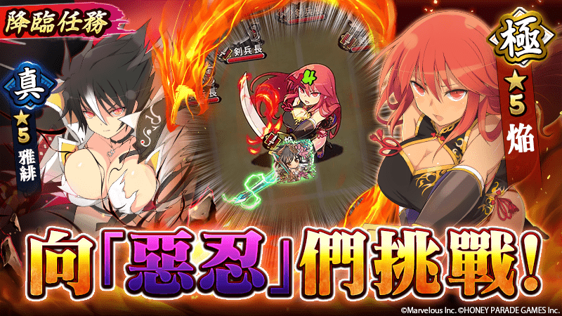 而「焔」、「雅緋」將作為降臨任務的 BOSS 登場,激動不已的「善忍」VS「惡忍」的戰鬥開幕,過關後有一定的機率可以獲得「焔」與「雅緋」。達成任務報酬,可獲得合作角色「焔&雪泉」,而排行報酬則可獲得合作角色「雪泉&斑鳩」。