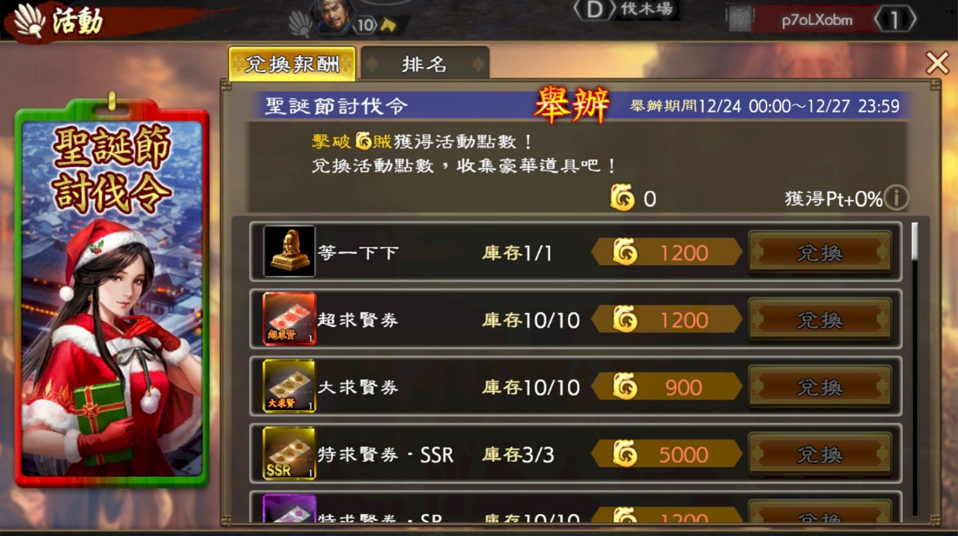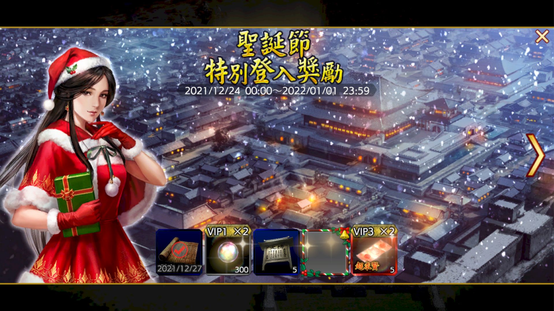 2021/12/24 00:00 ~ 2022/01/01 23:59 期間,為感謝玩家遊玩《三國志 霸道》,特別舉辦「聖誕節登入獎勵」活動。活動期間任意登入滿 2 天,即可獲得「免費寶玉 ×300」等獎勵。活動期間任意登入滿 5 天,即可獲得「超求賢券 ×5」等獎勵。