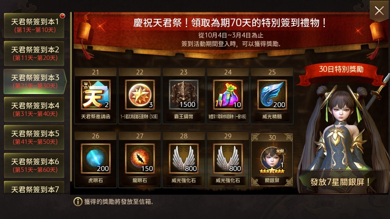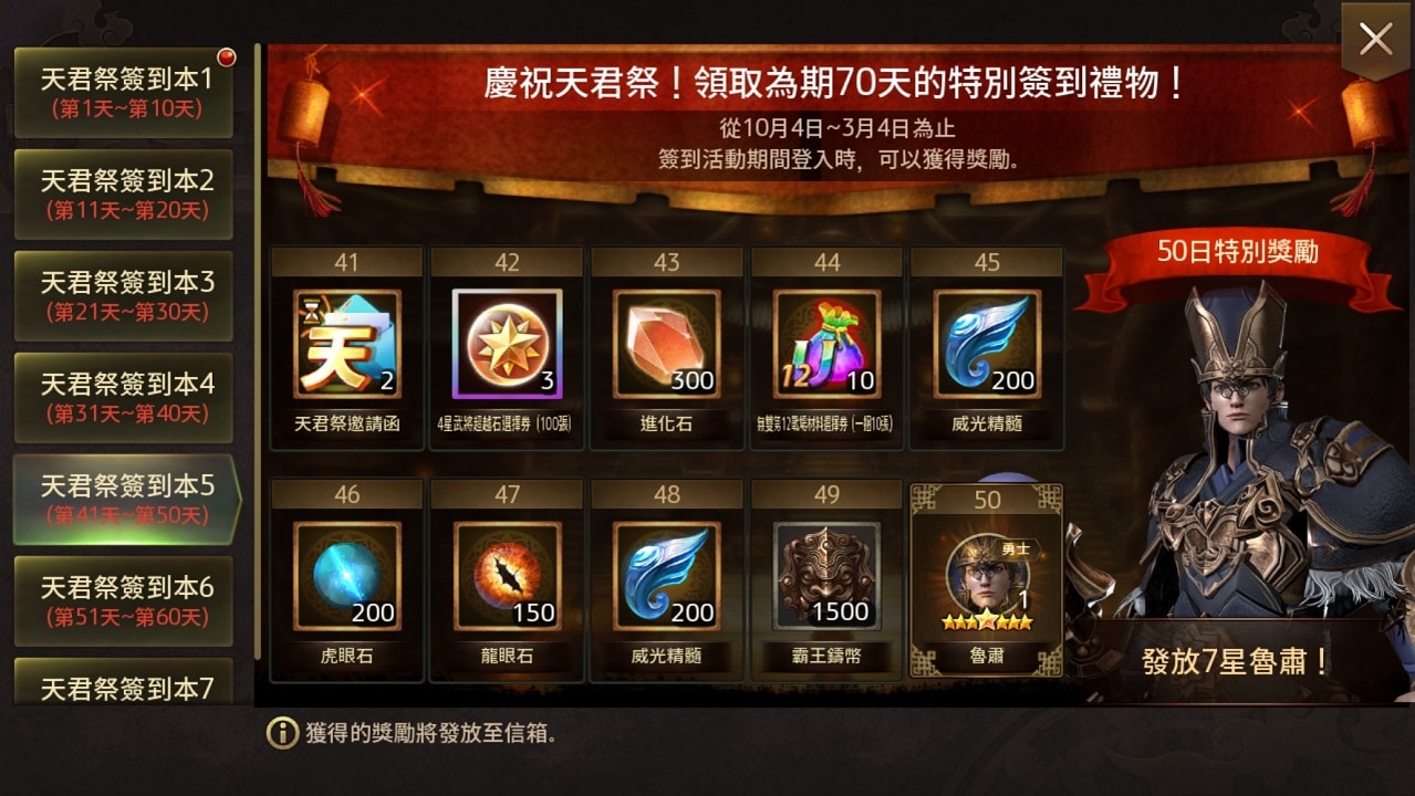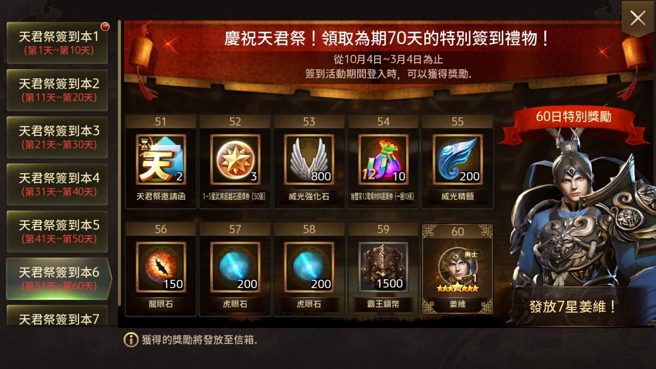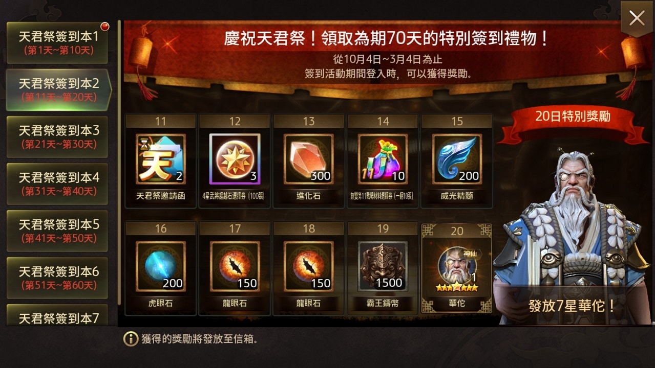 至下次維護前也將陸續推出各種更新紀念活動,包含「特別交換所活動」、「雙十節紀念神機妙算活動」、「不滅的忠臣老將典韋的特殊任務」等限時活動,凡達成指定任務即可獲得獎勵,領取稀有 4 星武將抽取券、稀有徽章、虎眼石、進化石、特級兵書、戰場材料選擇券等實用虛寶。