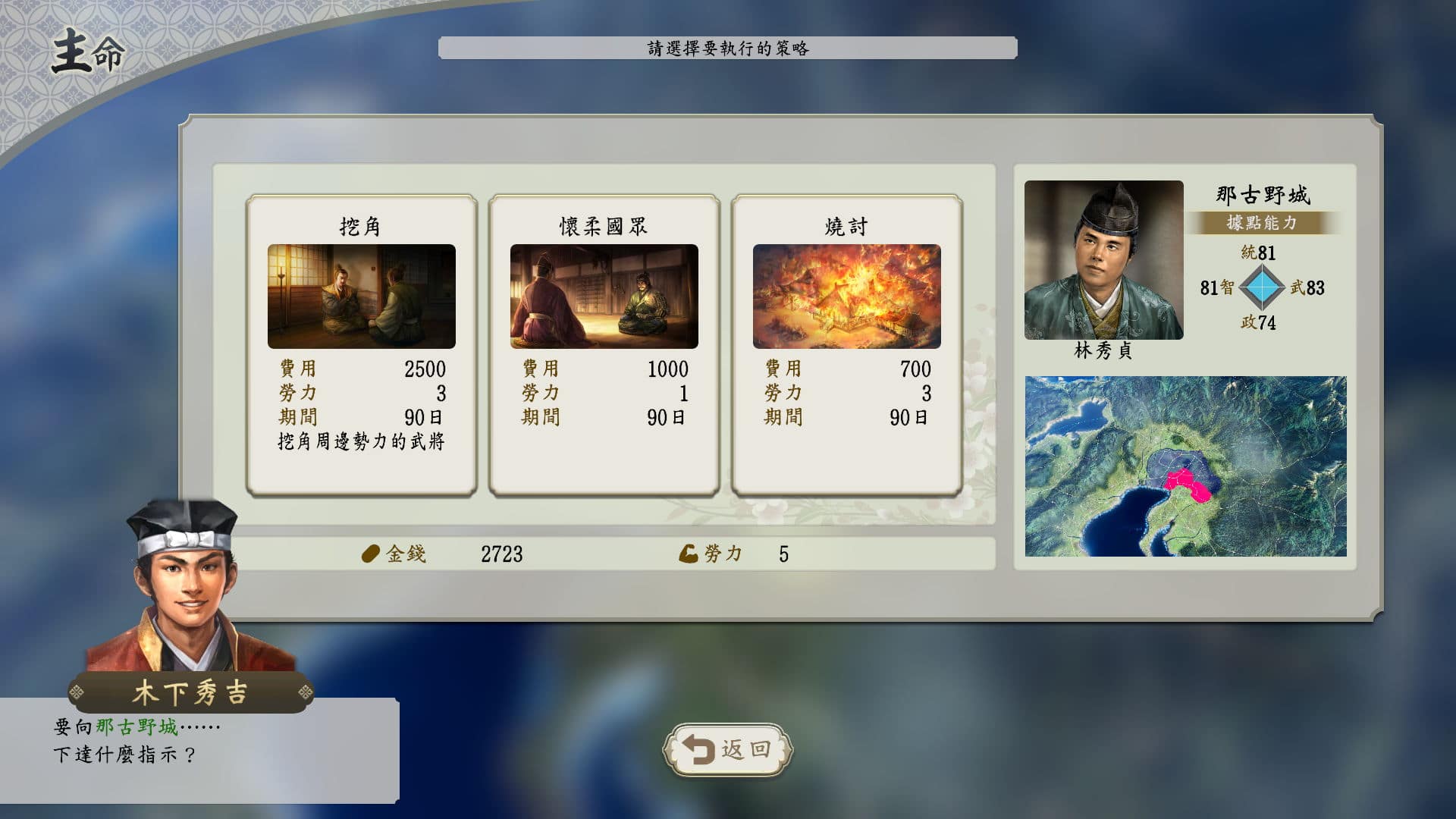 此外還有可指示進行據點強化及對敵據點謀略的「主命」。透過據點強化將使家臣遵循所指示的方針來強化內政,而指示進行謀略則將對敵勢力的據點進行妨礙工作。