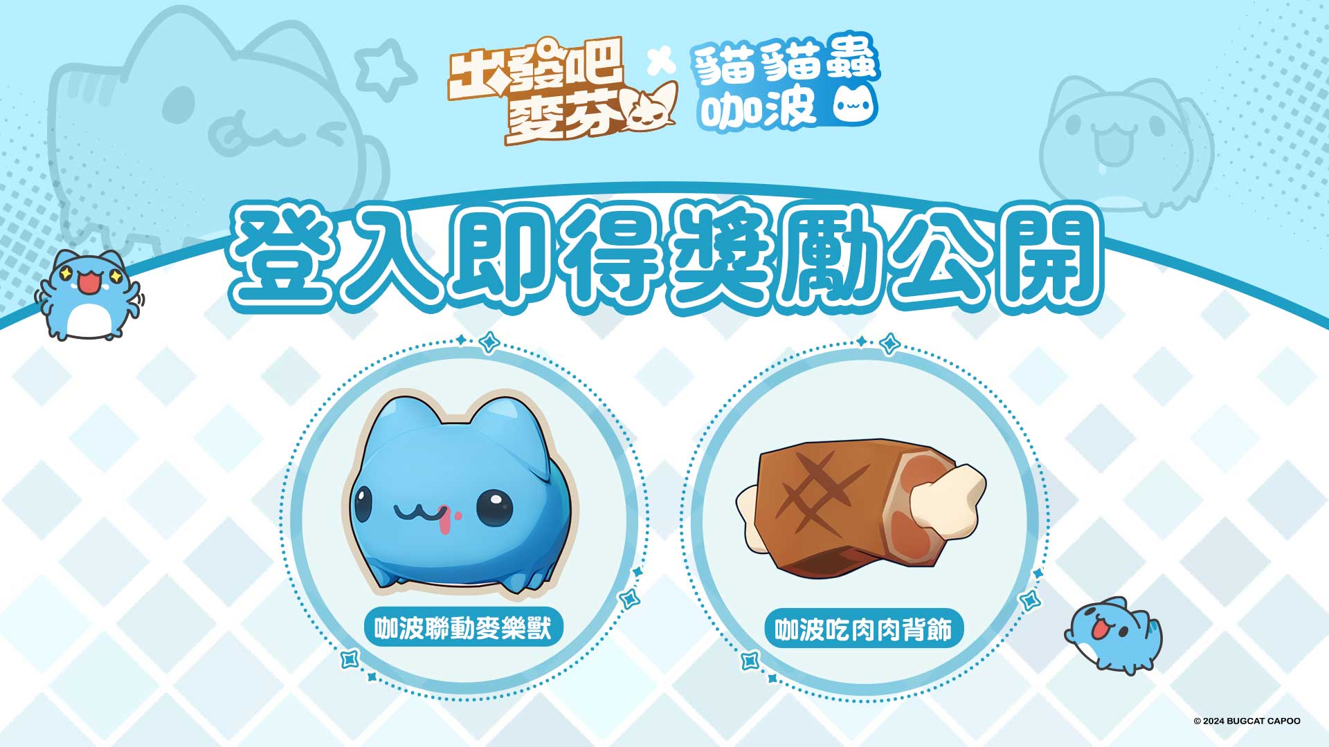 只要登入遊戲就能獲得「咖波麥樂獸」,合作活動期間,冒險家參與「咖波遊記」活動,於活動介面中完成指定任務,還能免費獲得「咖波啾咪」頭像、「咖波喵喵」頭飾、「變身咖波」服裝等專屬合作時裝造型,讓冒險家可以在麥芬的世界中化身咖波,展開找尋肉肉的驚奇之旅。