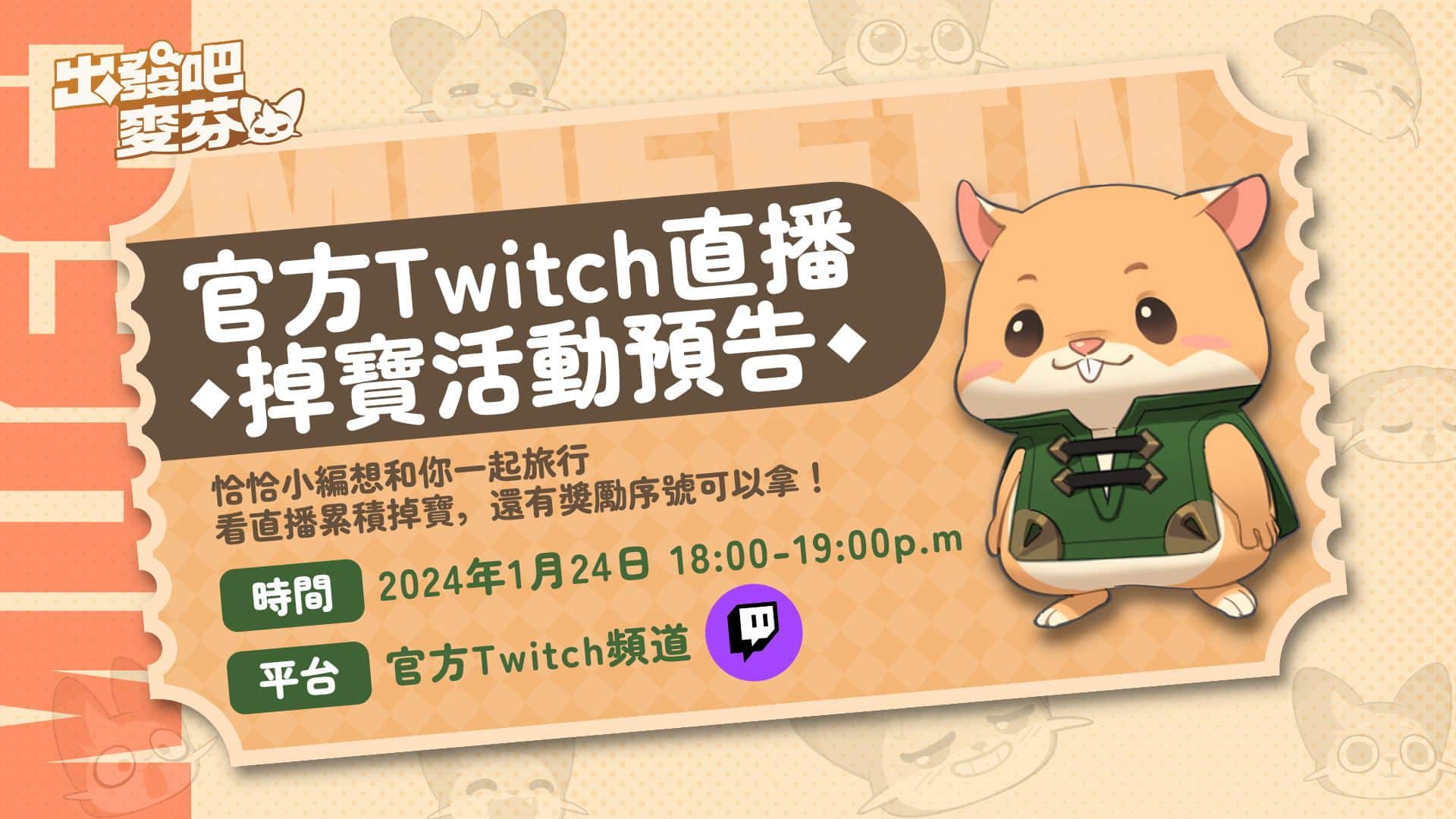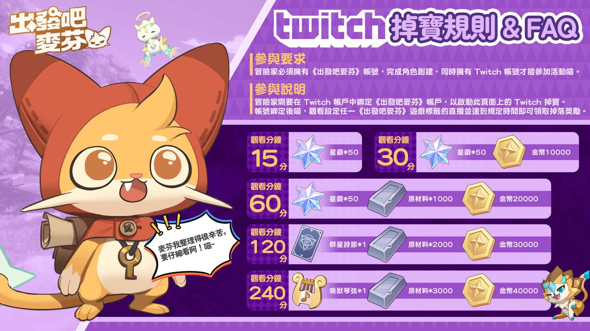除了一邊放置變強,也可以關注 Twitch「冒險專家」們的頻道,於 1/25 到 1/28 活動時間內,前往 Twitch 觀看《出發吧麥芬》官方直播及《出發吧麥芬》遊戲分類實況主達指定時數,即可將「星鑽」、「喚獸琴弦」、「群星詩節」等初期冒險必備資源輕鬆收進背包。