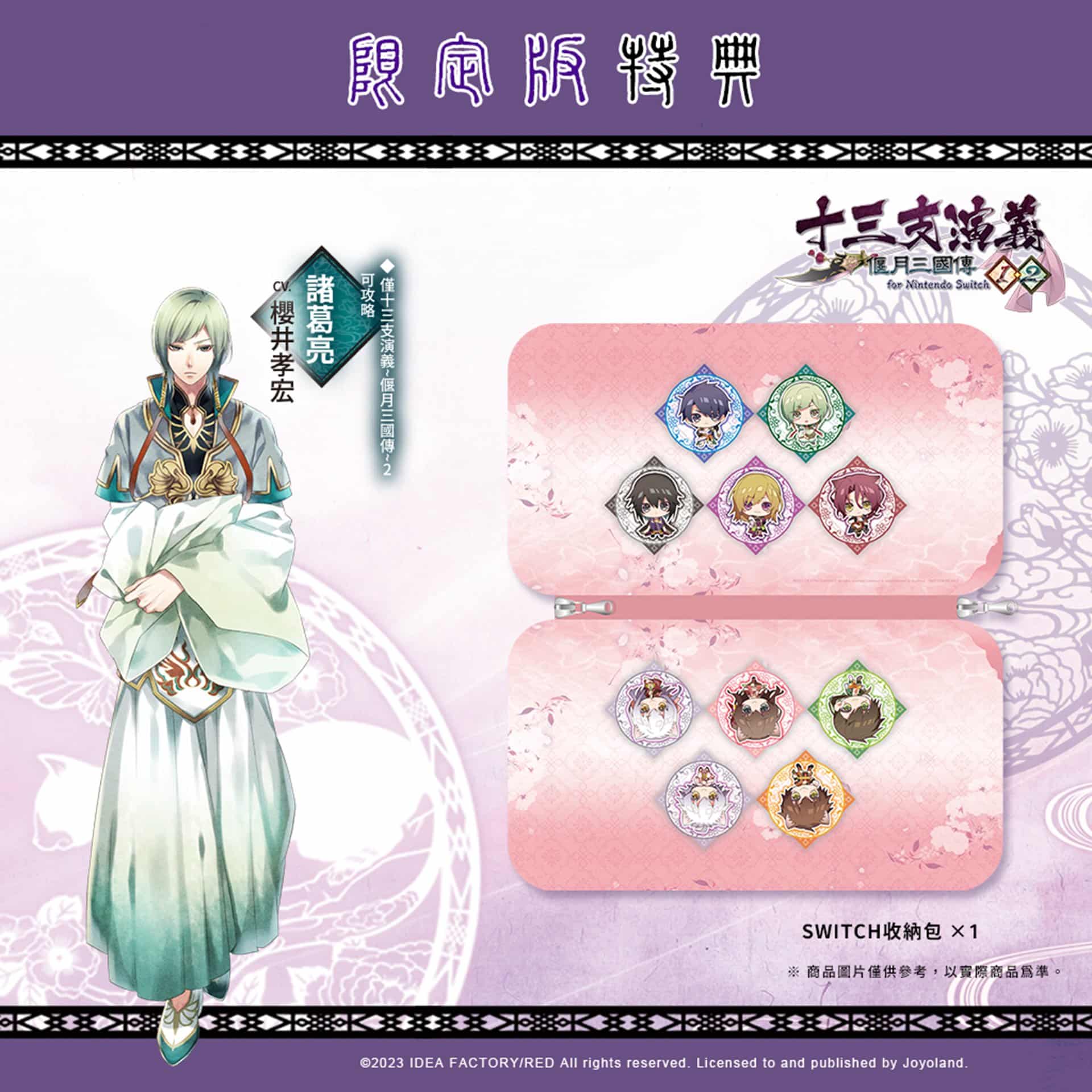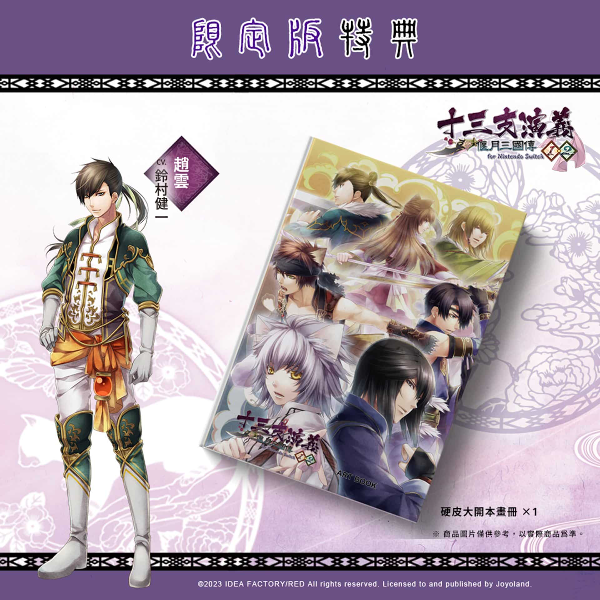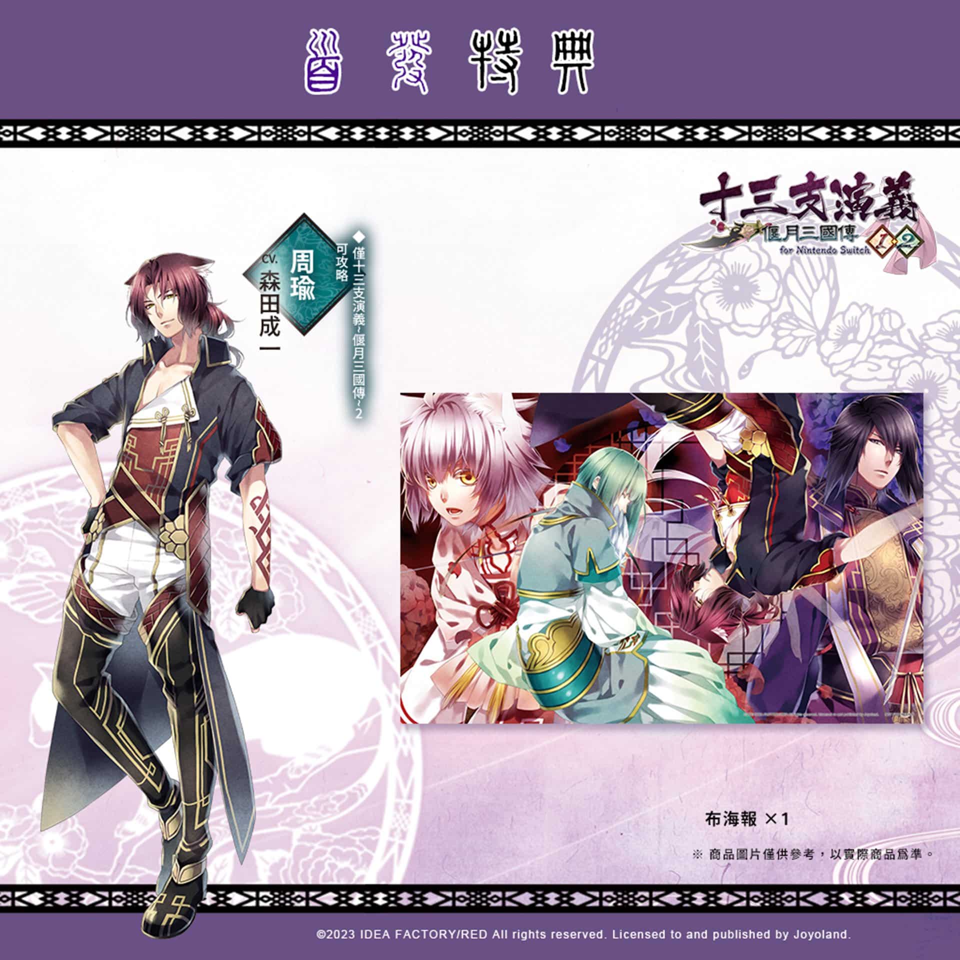 發行商 JOYOLAND 宣布,Idea Factory 旗下乙女遊戲品牌「Otomate」乙女作品女性向戀愛 ADV《十三支演義 偃月三國傳 1・2 for Nintendo Switch》NS 中文版將在 2023 年 12 月 28 日於亞洲區發售。並公開中文版獨家初回特典、限定版資訊,本次亞洲中文版獨家首發特典為 B3 大尺寸布海報一張。