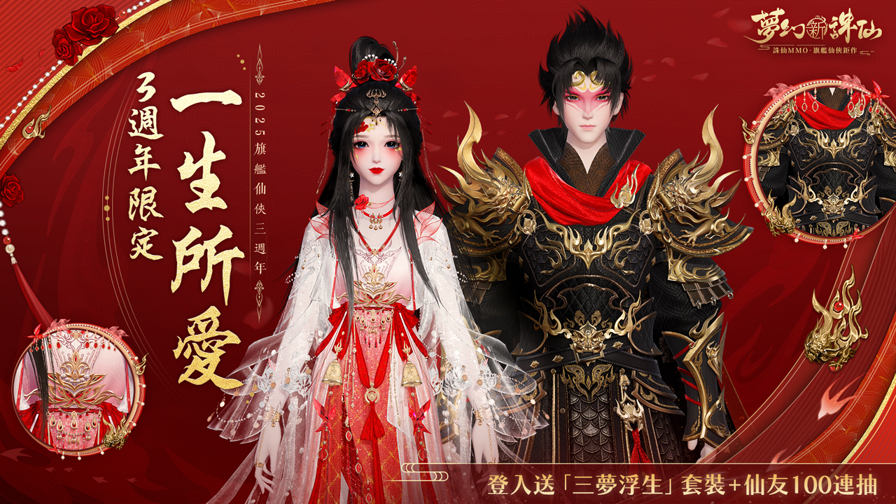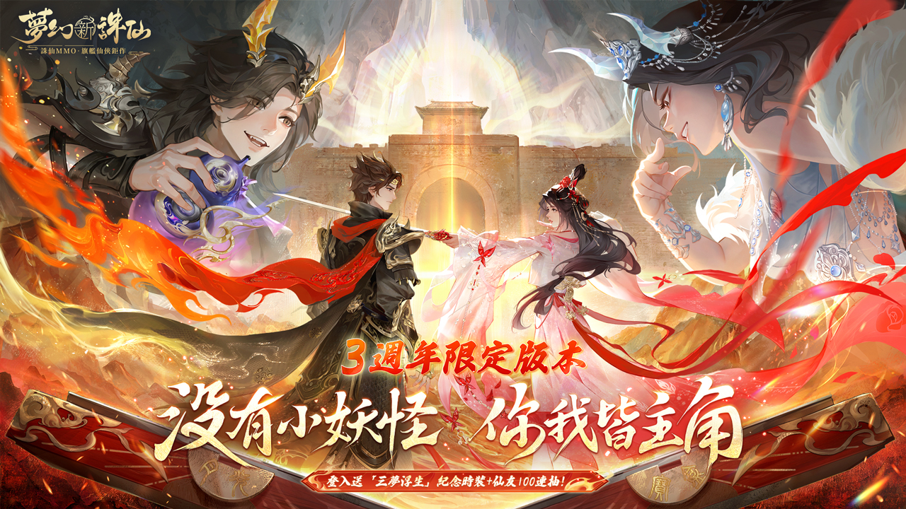 《夢幻新誅仙》手遊宣佈將於 3 月 13 日迎來三週年盛典,多項福利活動及新玩法即將上線。為歡慶《夢幻新誅仙》三週年盛典,營運團隊特別籌劃週年慶網頁活動回饋玩家。即日起,玩家只需到活動網頁完成登錄即可獲得三週年紀念時裝,三夢浮生,同時展開一系列週年限定活動,更迎來焚香少男角色,全新瑰寶武器,神龍破曉及雲頂天宮全新賽季等遊戲內容。