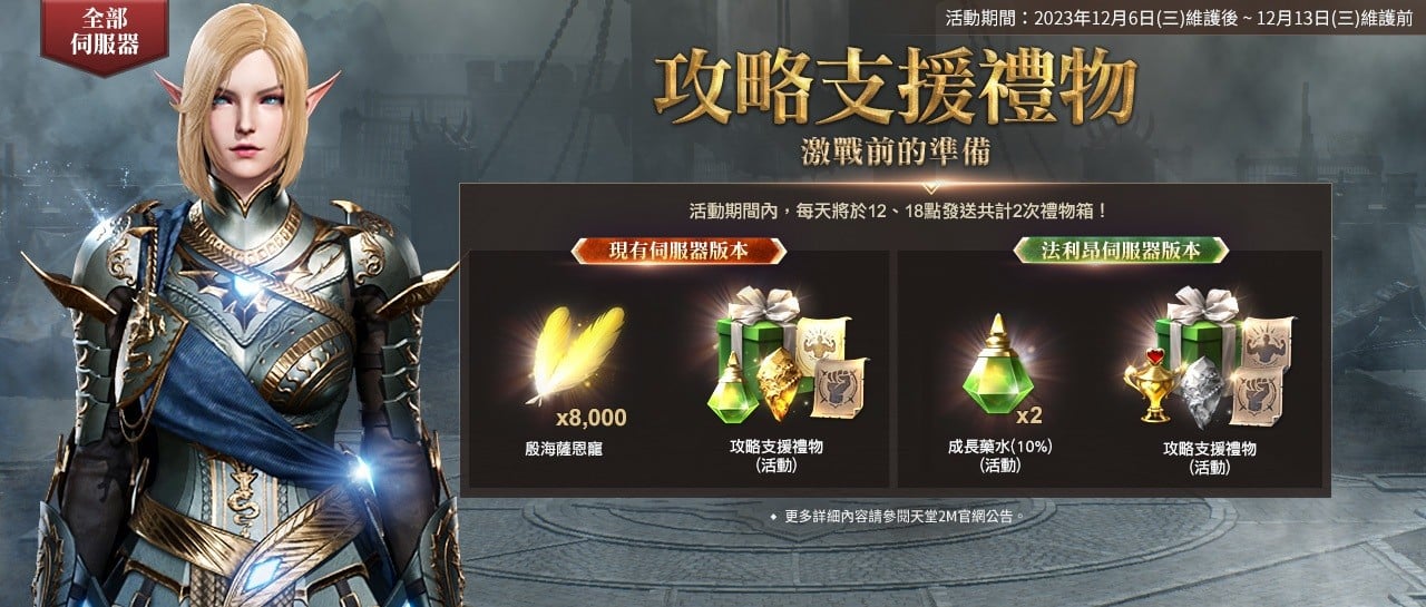 《天堂 2M》血腥風暴領主事前預約至 12/12 22:59,只要參加事前預約,即可獲得獎勵酷碰券。現有伺服器與法利昂伺服器可獲得包含【遠征隊戒指(活動)】、【遠征隊裝備支援箱(活動)】、【遠征隊禮物箱(活動)】等獎勵。新伺服器林德拜爾可獲得包含【遠征隊戒指(活動)】、【遠征隊裝備支援箱(活動)】、【林德拜爾禮物箱(活動)】等獎勵。