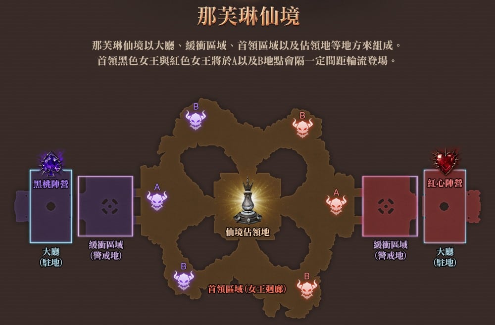 那芙琳仙境以大廳、緩衝區域、首領區域以及佔領地等地方組成,首領「黑色女王」與「紅色女王」將於 A 地點以及 B 地點間隔一定間距輪流登場;入場時,角色名稱以匿名設定,再前往黑桃陣營或紅心陣營。佔領戰開始 2 分鐘後,將於首領區域 A、B 地點輪流登場「黑色女王」與「紅色女王」,且 2 分 30 秒內無法攻略則消失。擊倒首領或對方陣營角色,也能於首領區域各處生成的箱子獲得金幣,並向大廳內仙境金幣商人購買對戰鬥有用的道具。