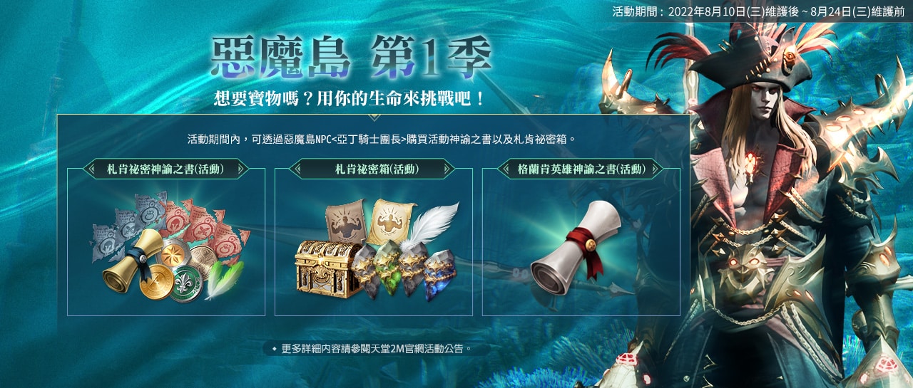 開放新競技場副本「惡魔島」,到 8/24 前,活動期間內 70 級以上角色可透過副本介面 → 競技場 → 惡魔島入場。惡魔島主要由首領札肯和海怪出現的海怪之巢為主,共由 5 個區域組成,包含【第 1 領域 - 船之墳】、【第 2 領域 - 人魚之森】、【第 3 領域 - 海底龜裂】、【第 4 領域 - 精靈之放逐地】、以及札肯所在地【海怪之巢】。擊敗海賊之王札肯有機會獲得包含「艾爾納項鏈、拉烏爾腰帶、蘊含魔力的墨水(神話)、札肯之魂」等獎勵。此外,海盜船附近將隨機發生「札肯金幣」活動,擊退來襲的大量怪物,就能獲得大量經驗值和獎勵。