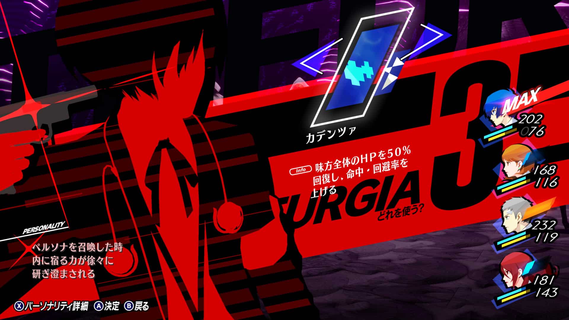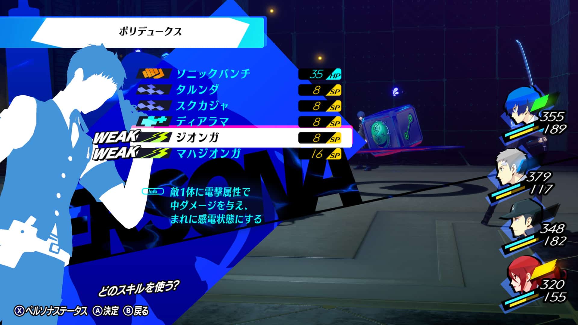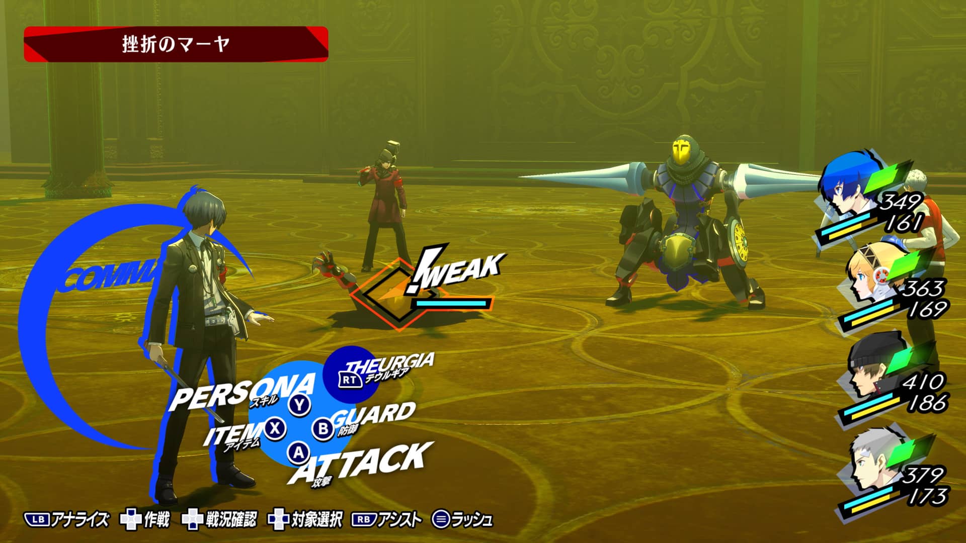 本作具有女神異聞錄系列耳熟能詳的回合制指令戰鬥系統,而且還變得更加強化,攻擊敵人弱點使其倒地後,就能再次進行攻擊。當敵人全部倒地時就能使出「總攻擊」。攻擊敵人弱點並妥善利用新的各種追加要素,讓戰鬥變得對我方更有利。