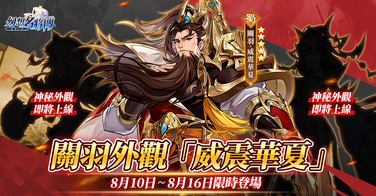 8 月 10 日至 8 月 16 日期間,遊戲內先行推出「關羽」限定時裝「威震華夏」,通過專屬活動即可解鎖蜀國大將「關羽」全新時裝。同時,官方也提前揭露兩款其他武將的外觀剪影。本次版本更新後,遊戲新增實時 BUFF 總覽面板以及抗滅內容總覽面板,同時新增顯示出手武將與對方所有武將的抗滅克制關係,可讓玩家更加清晰明瞭地掌控戰場局面。