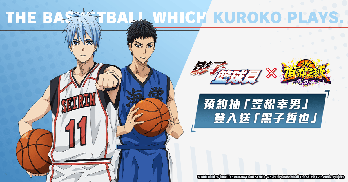 慶祝《影子籃球員》動畫播出十週年紀念,合作第三彈即將開始,現在參加聯動事前預約活動,會抽出 5 位幸運兒獲得「笠松幸男」。等合作開始後登入遊戲,還可以免費獲得「黑子哲也」,同時會有許多《影子籃球員》的相關活動,都會公佈在官方粉絲團。
