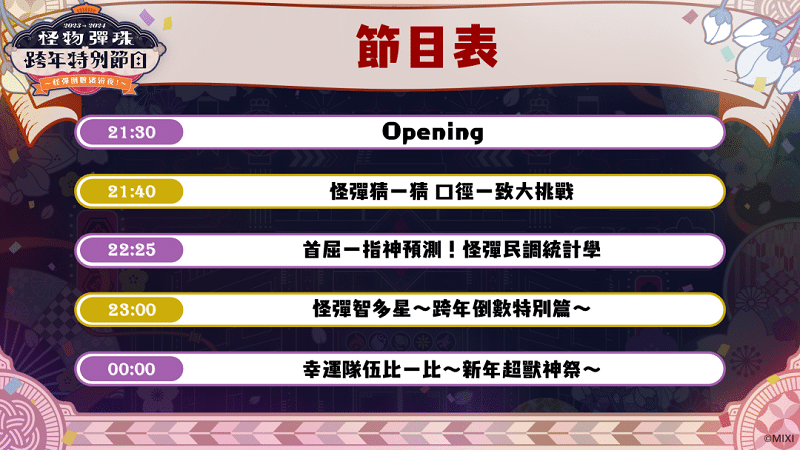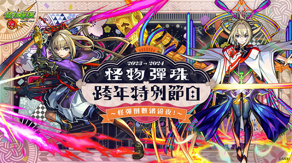 怪物彈珠官方 YouTube 頻道將於 12 月 31 日 21:30 起舉辦「2023 → 2024 怪物彈珠跨年特別節目 怪彈倒數繽紛夜!」直播,今年將由活動現場的來賓與彈珠好手們分成 4 組進行隊伍競賽。直播節目將有「怪彈猜一猜 口徑一致大挑戰」考驗隊員們的默契;「首屈一指神預測!怪彈民調統計學」邀請大家一起線上參與《怪物彈珠》首次的公開民意調查。為了迎接新年則會帶來「怪彈智多星~跨年倒數特別篇~」,這次準備了許多挑戰性的題目,彈珠好手們線上一起作答。