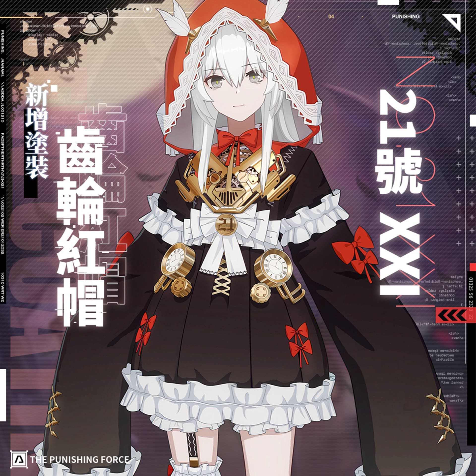 2021/11/25 到 2021/12/28 期間,玩家可以透過塗裝禮包購買「21 號.ΧΧΙ」塗裝「齒輪紅帽」。以某篇童話為基調設計的塗裝。短裙、蝴蝶結、嬌小的紅帽,空白的少女並不知曉這身打扮的含義,也不曾考慮過為什麼需要「打扮」。然而當她看到他人見到她露出的笑容時,卻會覺得「暖洋洋的」。