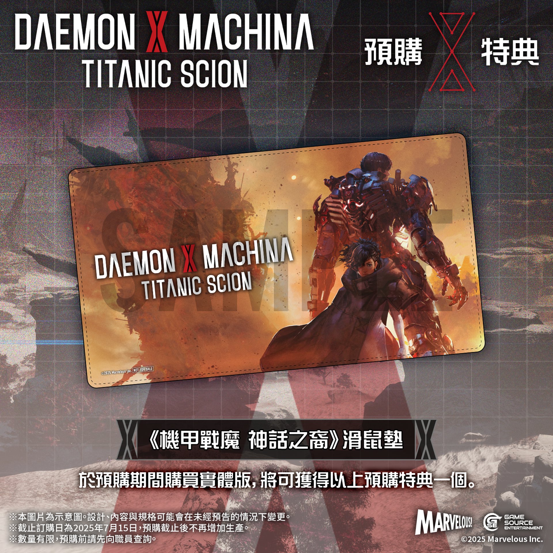 GSE 宣佈,由 Marvelous 開發及發行的機甲動作遊戲 DAEMON X MACHINA TITANIC SCION《機甲戰魔 神話之裔》將於 2025 年 9 月 5 日在 Nintendo Switch 2/PlayStation 5/Xbox Series X|S /Steam 發售。本作由 GSE 負責代理 Nintendo Switch 2 及 PlayStation 5 亞洲實體版,並正式開放預購。