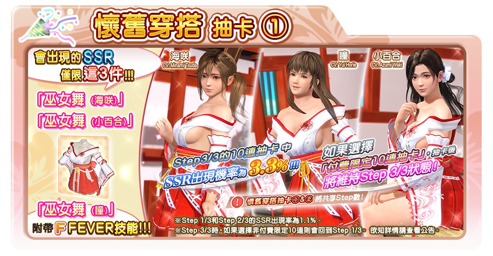 此外,也舉辦了可以獲得正適合新年試手運的「神籤棒」登入獎勵活動。每天贈送 1 個或 2 個「神籤棒」(最多 7 天),有機會獲得最多 10000 個免費 V 心石,「風潮穿搭抽卡」中,「筑紫」、「蒂娜」、「香蒂」等女孩的 SSR 泳裝「巫女舞」登場。是正適合新年的應景泳裝,也請務必參考看看。