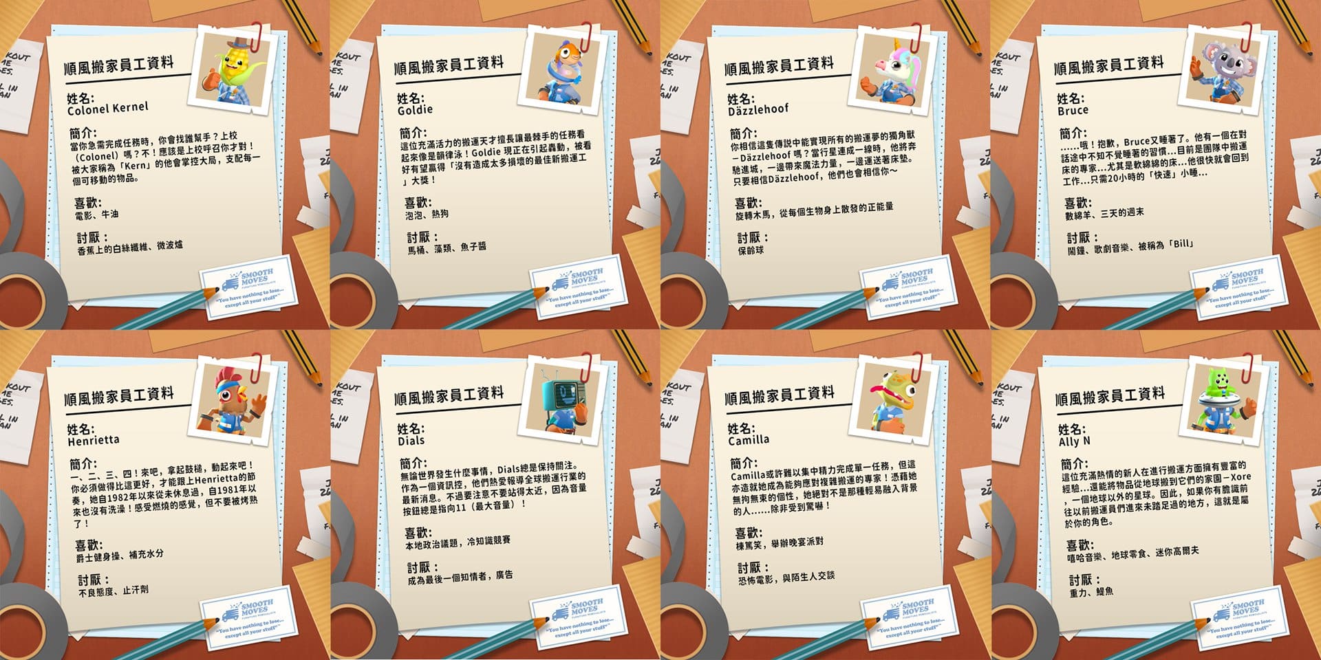 除了舊班底「神奇五俠(Fab 5)」的 Mel、Sidney、Rye Yu、Nim 和 Steve 以外,《胡鬧搬家 2》還有另外 40 多位同事,總共 51 位可遊玩角色。