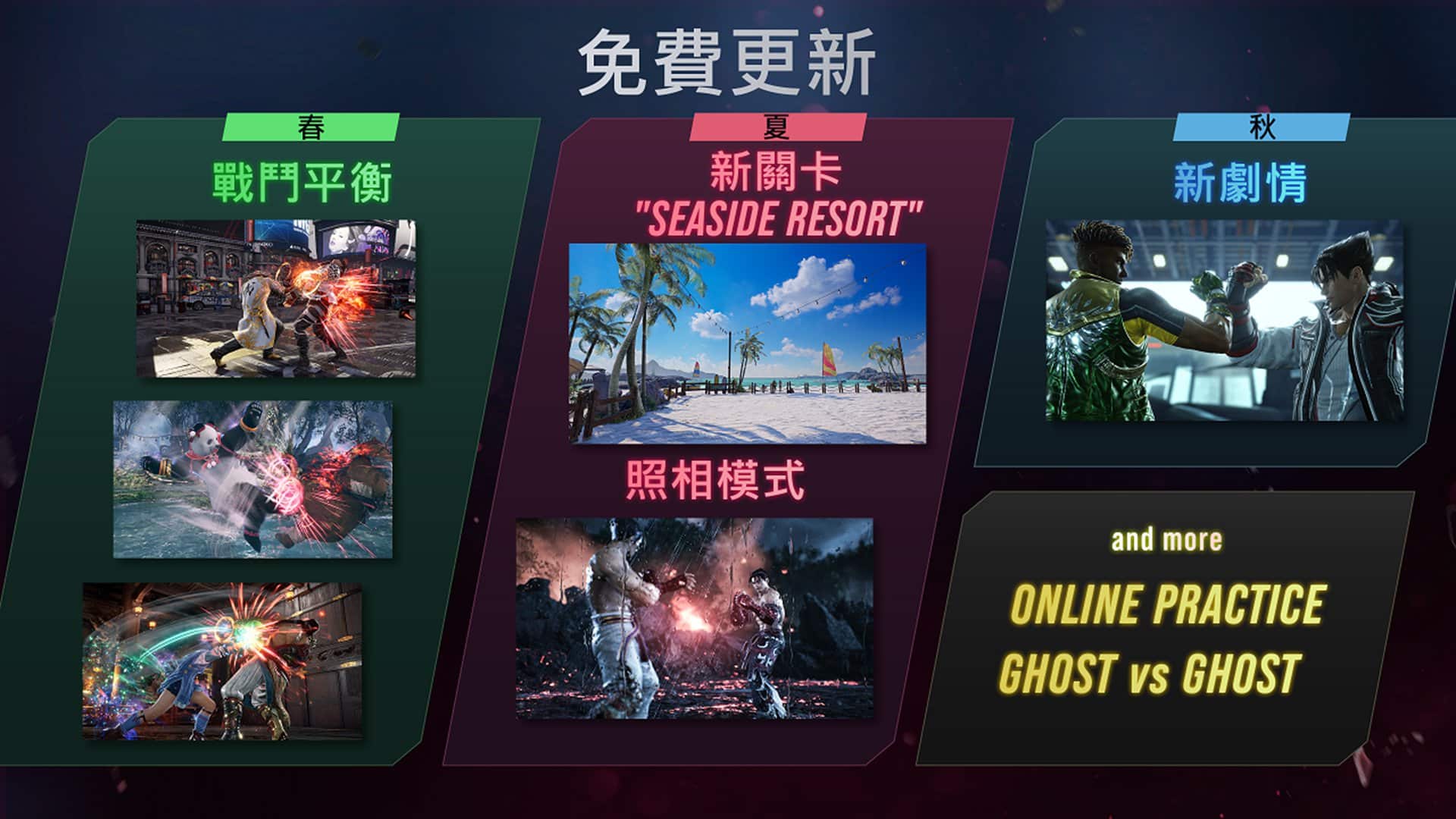 夏季即將發布的免費大型更新中,將包含夏日主題關卡「Seaside Resort」,以及「照相模式」。此外,除了在秋季免費更新中即將新增「Eddy Gordo」亦將在其中登場的全新劇情外,更發表了將於日後追加的「Ghost vs. Ghost」及「Online Practice」模式。