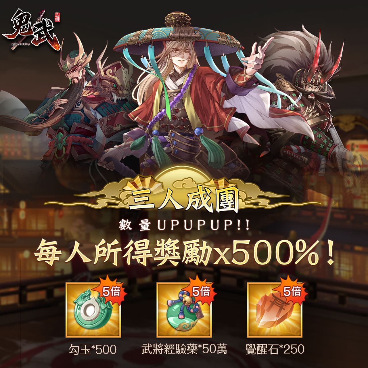 《鬼武三國》即日起啟動事前預約活動,參加活動的玩家除了可以獲得占卜琉璃球、覺醒石、銅錢等預約獎勵,再加入雙平台預註冊,就能帶走勾玉、武將經驗藥、覺醒石。然而玩家可以邀請兩位好友相聚三國,一起領取 5 倍獎勵。在遊戲正式上線後,玩家還可領取代言人「胡宇威」特別準備的「2023 抽」,以及限定專屬稱號。