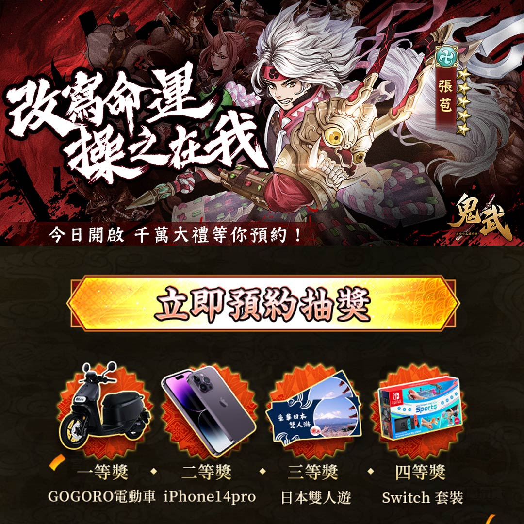 由香港喵玩代理的三國卡牌手遊《鬼武三國》繁中版,啟動事前預約及雙平台預註冊活動,同步公開遊戲特色,讓玩家先睹為快,官方也特別邀請「胡宇威」擔任遊戲代言人。此外,凡是參加事前預約的玩家,還有機會抽到「Gogoro 電動機車」、「iPhone 14 Pro」、日本雙人遊等獎。
