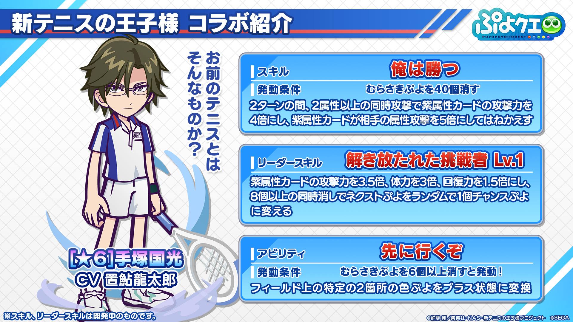 SEGA 旗下手機遊戲 ぷよぷよ!!クエスト《魔法氣泡!!Quest》發表將與電視動畫《新網球王子》在 8 月 9 日到 8 月 29 日舉辦合作活動。這次活動中預定將舉辦合作轉蛋推出「越前龍馬」、「手塚國光」、「跡部景吾」等角色,也會有限定關卡跟限定故事提供給玩家挑戰。