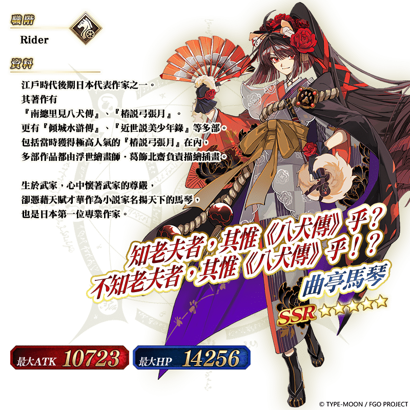 首波 PICK UP 召喚特別推出新登場的「★5(SSR)曲亭馬琴」,活動時間從維護後開始至 5 月 7 日,將以其寶具「南總里見八犬傳」賦予自身〔魔性〕特攻狀態,並對敵方全體發動強大的〔惡〕特攻攻擊,為御主提供編制策略上更多樣化的選擇。