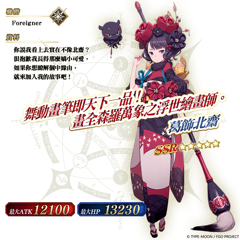最後一波召喚從 4 月 23 日至 4 月 30 日,「★5(SSR)葛飾北齋〔Foreigner〕」將以獨特的 Foreigner 職階和強力的寶具「富嶽三十六景」,對敵方全體發動強大的〔擁有人之力的敵人〕的特攻攻擊。