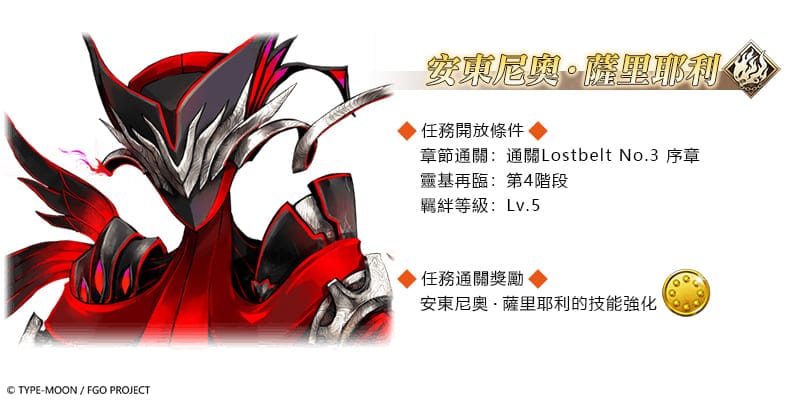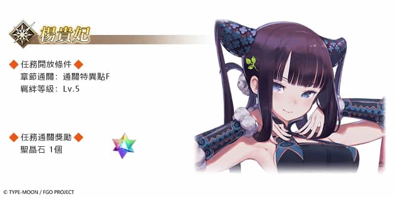 率先於舉辦的「幕間物語紀念活動 第 16 彈」,將永久開放「阿斯托爾福〔Saber〕」、「凱妮絲」、「曼迪卡爾多」、「安娜塔西亞」、「莎樂美」、「安東尼奧・薩里耶利」及「楊貴妃」等 7 騎從者的幕間物語,且在強化上述從者時,大成功、極大成功的發生率,將限時提升為 2 倍。而所有從者的幕間物語任務 AP 消耗量,更將限時降為 1/2。