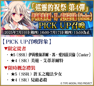至 2025 年 7 月 19 日15:59 以前舉辦的『「巡靈的祝祭 第 4 彈」PICK UP 召喚』,將登場限定從者「★5(SSR)伊莉雅絲菲爾.馮.愛因茲貝倫〔Caster〕」、「★4(SR)美遊.艾蒂菲爾特」與常駐從者「★5(SSR)阿爾托莉亞.潘德拉剛〔Saber〕」、「★5(SSR)貞德〔Ruler〕」等在內的 6 騎從者及 6 種限時概念禮裝的 3 種召喚卡池開放。
