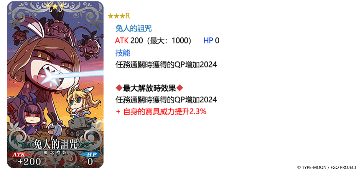 活動期間內,從者強化與概念禮裝強化時,大成功(經驗值 2 倍獎勵)以及極大成功(經驗值 3 倍獎勵)的發生率限時提升為 3 倍。同時,迦勒底之門中出現的任務「蒐集種火」和「修練場」將限時全部開放,且 AP 消耗量限時降為 1/2;主線任務第 2 部第 6 章為止的 AP 消耗量,也將限時降為 0。