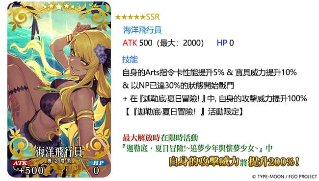 當挑戰「迦勒底.夏日冒險!~追夢少年與懷夢少女~」時,裝備「迦勒底.夏日冒險!PICK UP召喚1」實裝的「★5(SSR)天使之心」、「★4(SR)粉紅海灘」及「★3(R)叢林海盜」等三款概念禮裝,除了擁有既有的增益效果,還能有效提升機率掉落的「海盜彎刀」、「海盜啤酒杯」及「海盜頭巾」等活動道具數量。
