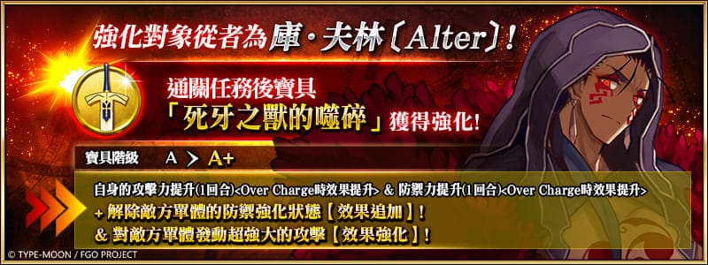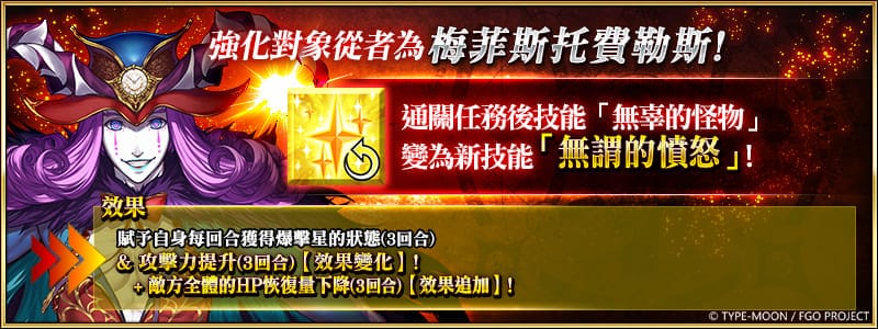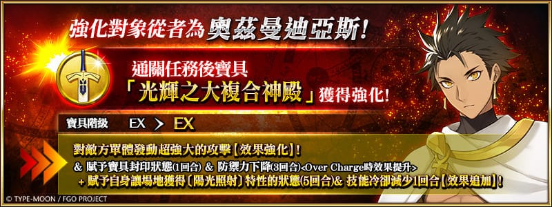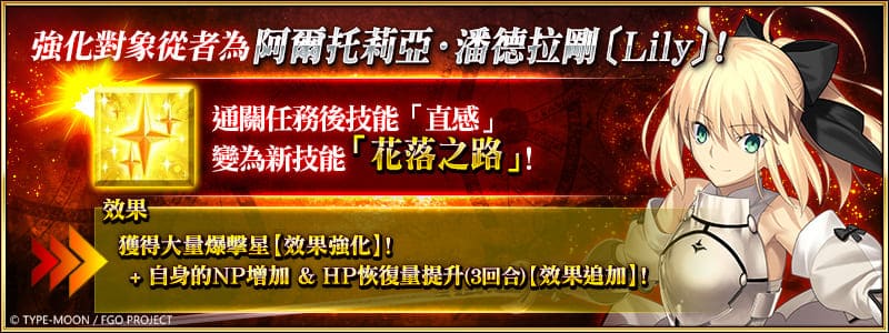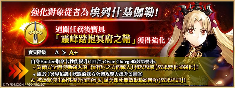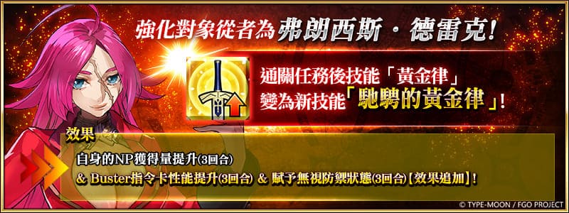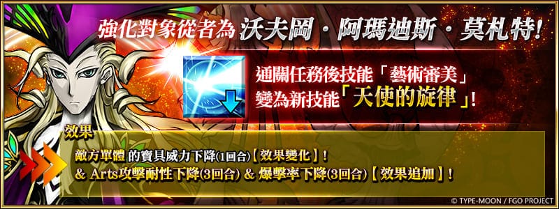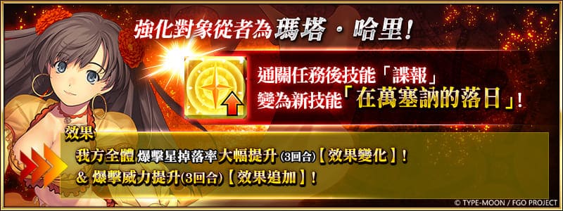 主線任務第 2 部 5.5 章為止的主線任務 AP 消耗量,將降為 1/2(原本第 2 部第 5 章 奧林帕斯至第 5.5 章的 AP 消耗量,由限時降為 1/2 調整為永久生效)。而通過主線任務及自由任務,敵人隨機掉落的「種火的稀有度」及「QP 獲得數量」將永久提升之外,其他道具的掉落機率也將有所微調。迦勒底之門中,所有每日任務的 AP 消耗量,將限時降為 1/2;每日變更的「蒐集種火」及「修練場」,除了限時全部開放,其中的「蒐集種火」及「打開寶物庫之門」更將永久新增高難度「極級」。而在進行強化從者及概念禮裝時,大成功、極大成功的發生率,將限時提升為 3 倍。