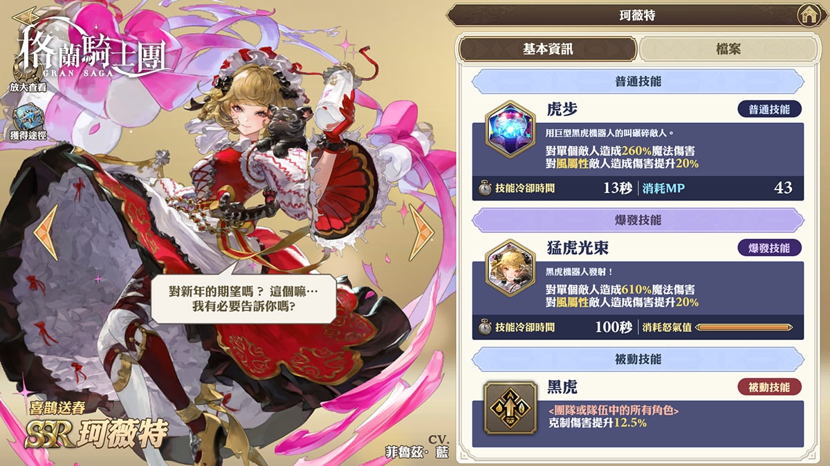 珂薇特:庫伊專屬新春 SSR 格蘭武器,爆發技能可對敵方單體造成超大量魔法傷害,若敵方為風屬性,傷害將額外提升;此為具有對剋制的屬性造成傷害增加的被動技能,可以有效提高隊伍的傷害,在 PVE 中有非常明顯的效果。