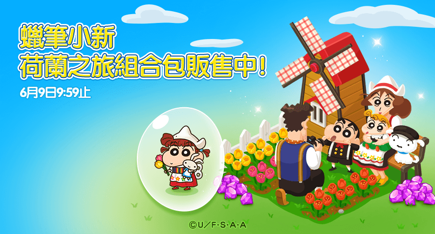 這次合作活動推出了「蠟筆小新荷蘭之旅組合包」,組合包裡包含「荷蘭妮妮」小夥伴、「野原家和風車」裝飾及一張「合作限定精選扭蛋券」,在活動期間使用此扭蛋券時,合作角色出現的機率與「蠟筆小新」階段獎勵扭蛋相同,每人限購 1 組。「向日葵班的點心教室」也期間限定登場,只要製作出各種巧克比就可以到「吉永老師的交換商店」來兌換特別的合作道具。把「蠟筆小新:世界之旅」的角色設置在欄位中,還能夠讓角色使用能力來幫忙生產巧克比。