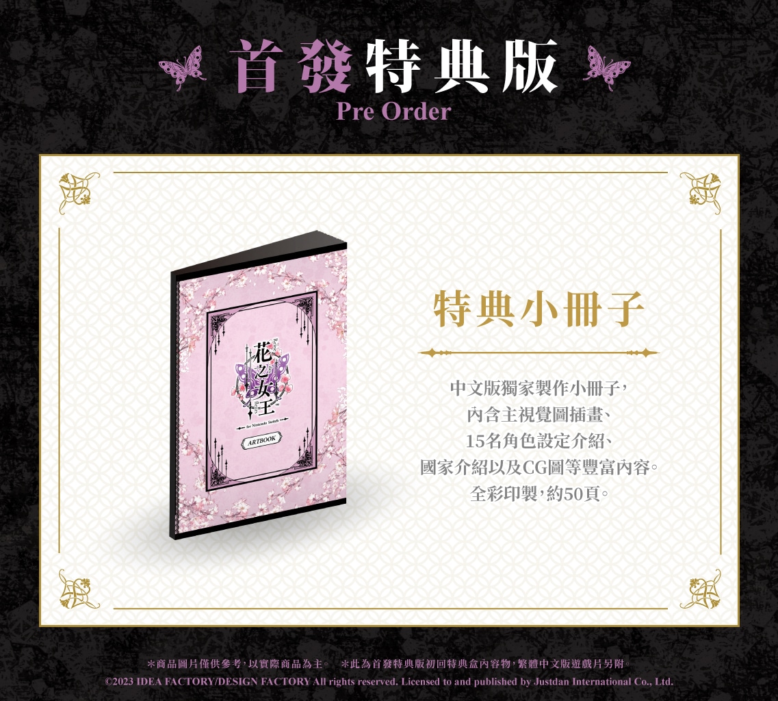 本次首批實體版本也將免費升級為「首發特典版」,並附贈亞洲中文版專屬製作的小冊子。除了主視覺插畫外,也包含角色設定介紹、CG 圖等內容,讓華文圈的乙女玩家也能享受到獨家的特典內容,更值得玩家購入珍藏。