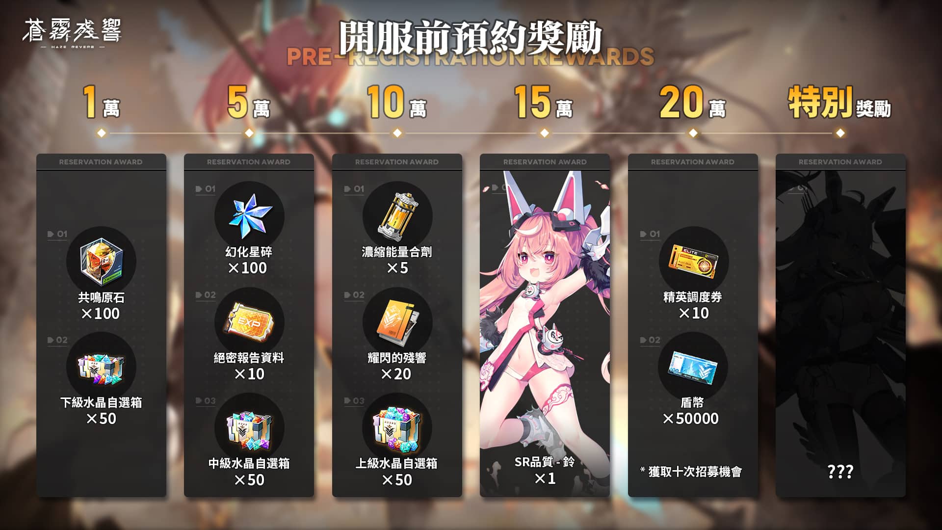 遊戲即日起展開事前預約活動,根據玩家的預約數可獲得相應等級的獎勵,而突破 15 萬人不僅有狂抽亂送的福利,還將可獲得「SR 駕駛員 鈴」。除此之外,更有不可言說藏在浴室裡的禁斷巨浪,將襲捲而來,目標全預約達成,解放全福利內容。
