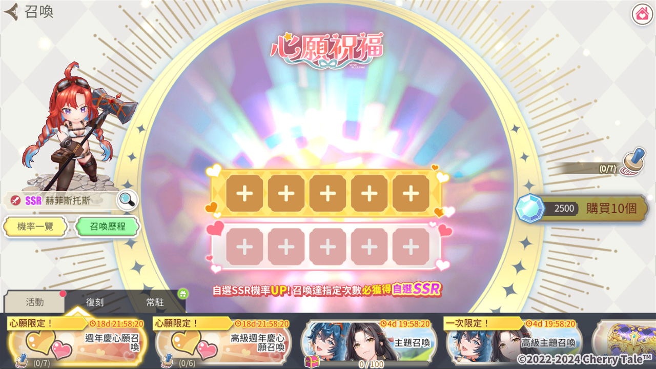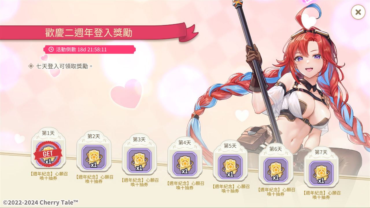 活動期間登入即可獲得【二週年心願召喚十抽券】、【新手心願召喚十抽券】以及【免費禮包】,使用心願召喚券時,玩家可自選心儀角色並放入獎池,提升獲得喜愛角色的機會。