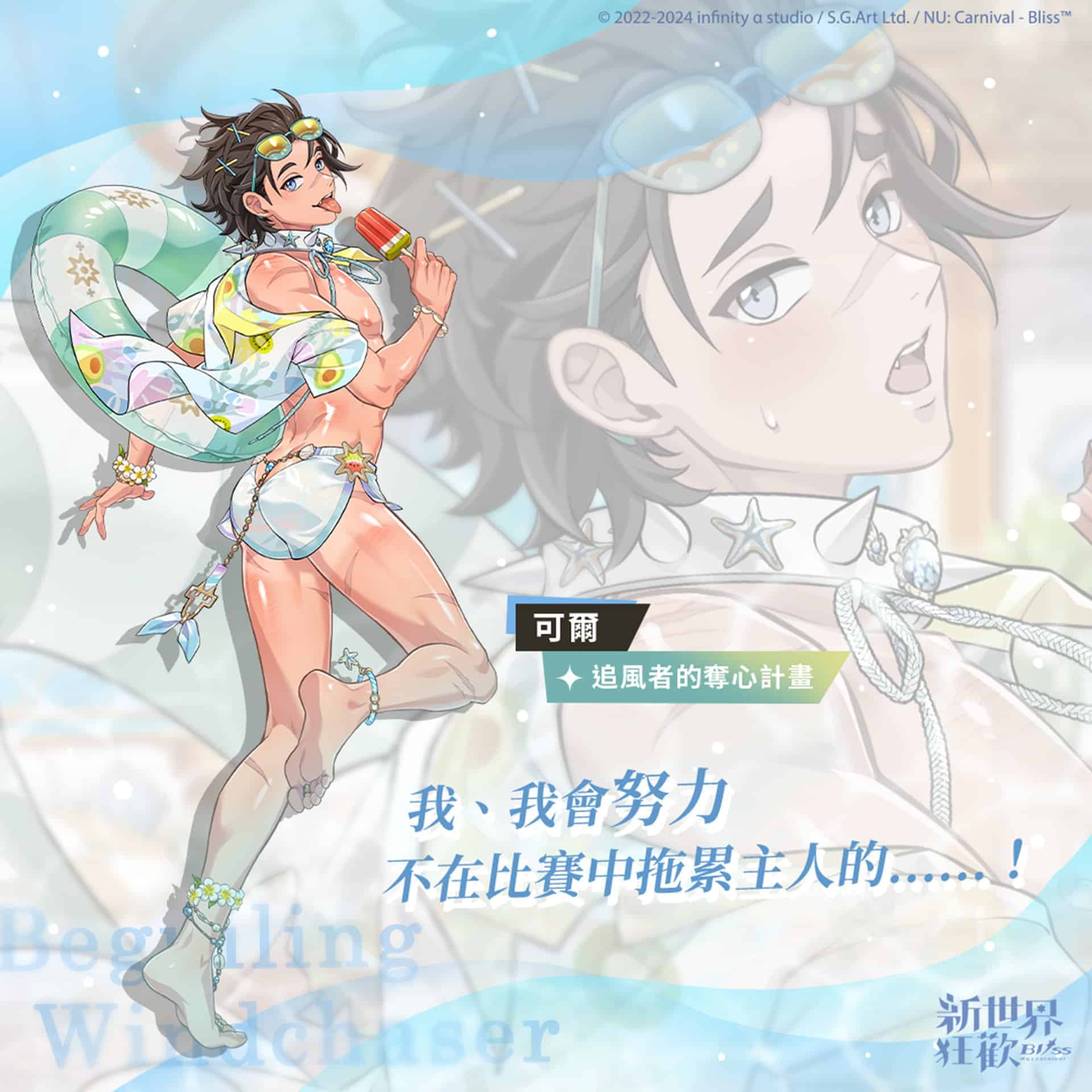 至 8 月 1 日,活動限定卡池將同步開啟,「★SSR 登陸者的盛夏冠冕|崑西」、「★SSR 追風者的奪心計畫|可爾」及「★SSR 馭浪者的海中粼光|啖天」獲得機率將大幅提升。此外,於活動期間累計登入達 10 天,即可免費獲得活動限定蜜話道具「催情椰子水」和魔力契約等獎勵。