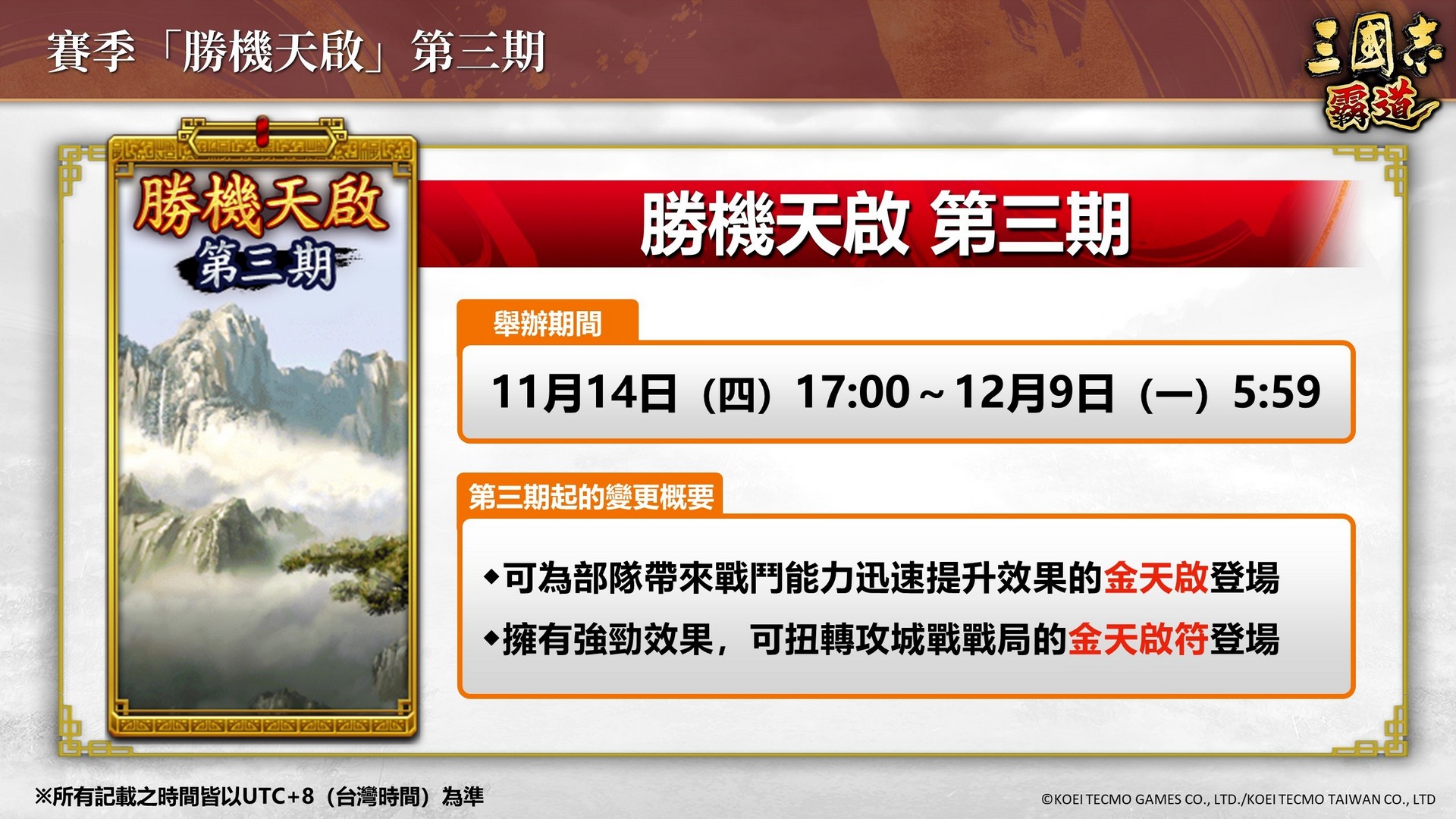 光榮特庫摩宣布,唯一由《三國志》系列之本家日本光榮特庫摩推出 MMO 戰略模擬手機遊戲《三國志 霸道》,目前已完成 11月 更新,賽季「勝機天啟」進入第三期。可為部隊帶來戰鬥能力迅速提升的金天啟,以及可扭轉攻城戰戰局的金天啟符登場,使戰鬥變得更有策略性。