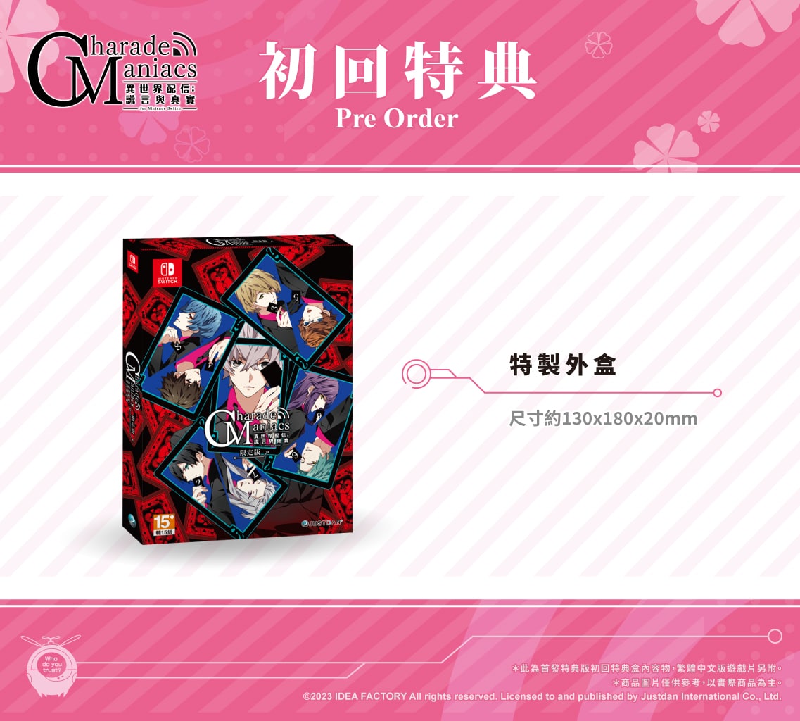 傑仕登宣布,由 Idea Factory 旗下品牌「Otomate」出品,懸疑戀愛 AVG《CharadeManiacs 異世界配信:謊言與真實》,確定將於 2023 年春季於亞洲推出繁體中文版。本次初回特典也將同步升級成首發特典版,玩家將可以用一般版的價格,獲得原日文版預購或購買限定版才能獲得的眾多收藏內容。