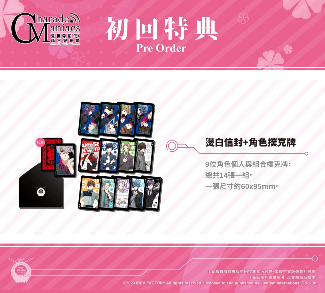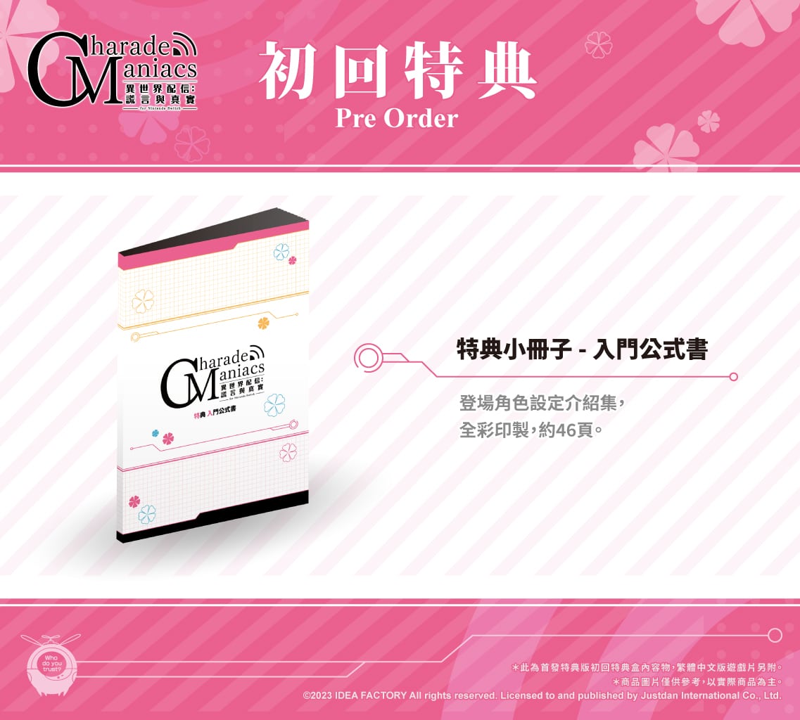 首批《CharadeManiacs 異世界配信:謊言與真實》實體版本,將免費升級為「首發特典版」。玩家可以用一般版的價格,獲得原日文版預購或購買限定版才能獲得的兩本特典小冊子「入門公式書」以及「完全攻略書」,同時兩本小冊子的內容也將完整中文化,呈現給每一位亞洲粉絲。除了特典小冊子外,本次也將為亞洲中文版獨家設計精美的「燙白信封 + 角色撲克牌」供喜愛本作的玩家收藏。