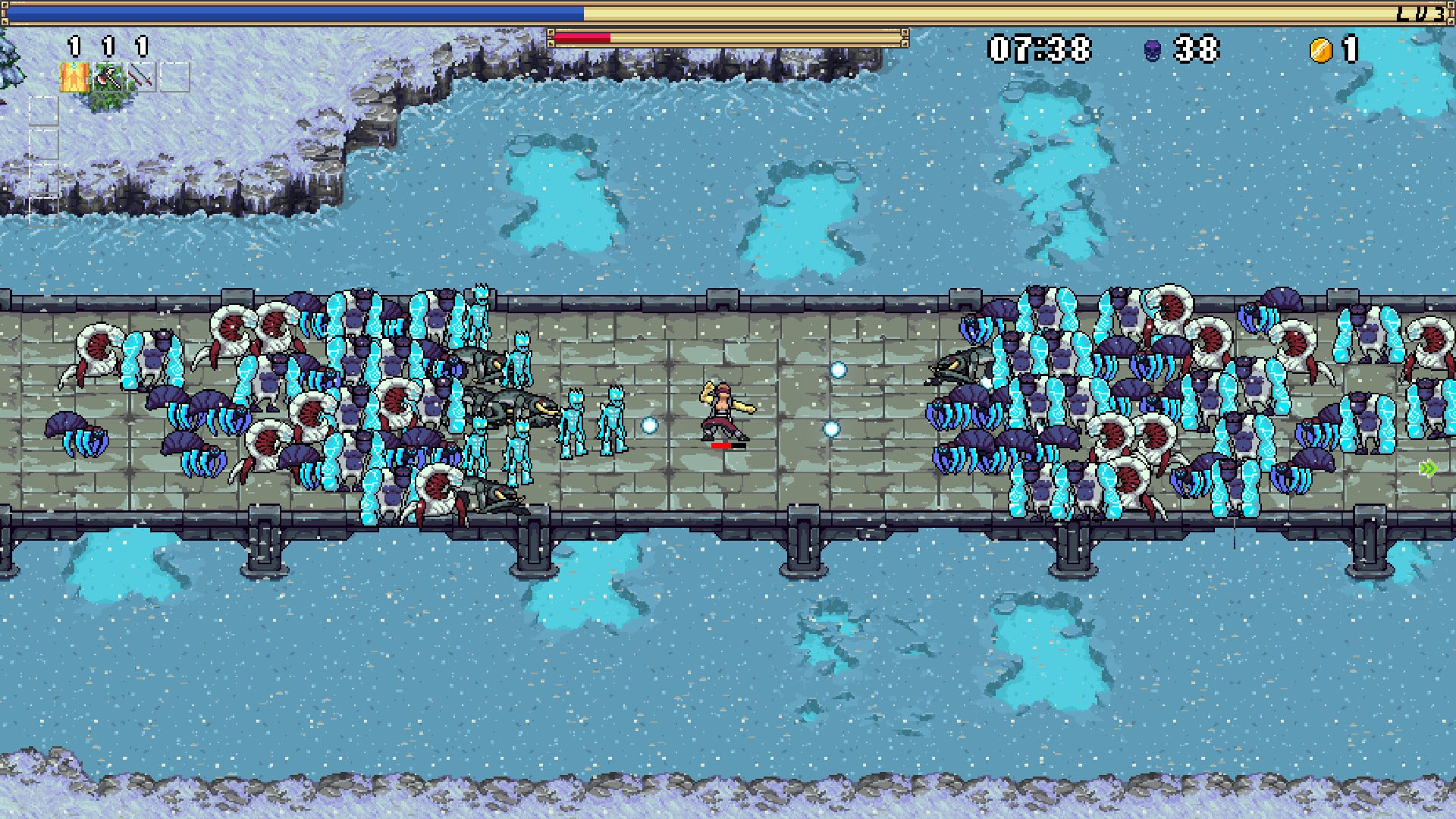 如同《Vampire Survivors》,每個使用角色搭配很多種強化方向帶給玩家每次挑戰都不同的樂趣,比較大的特色就是有強力必殺技的存在,使用時還會有充滿魄力的動畫演出,幫助玩家橫掃千軍。