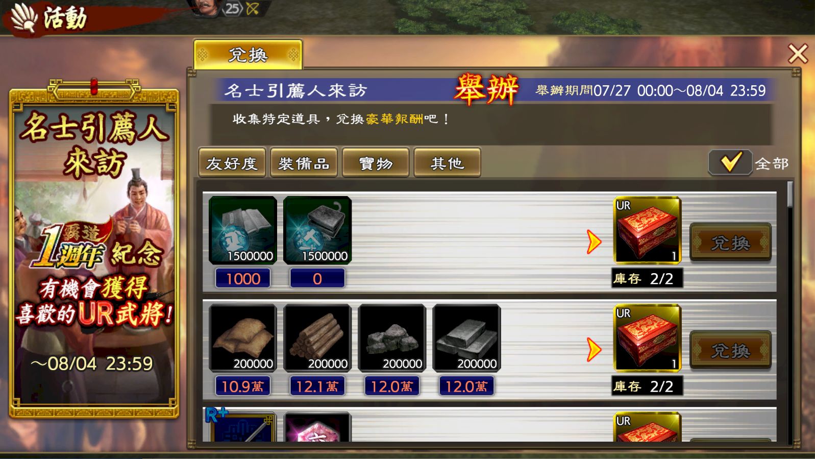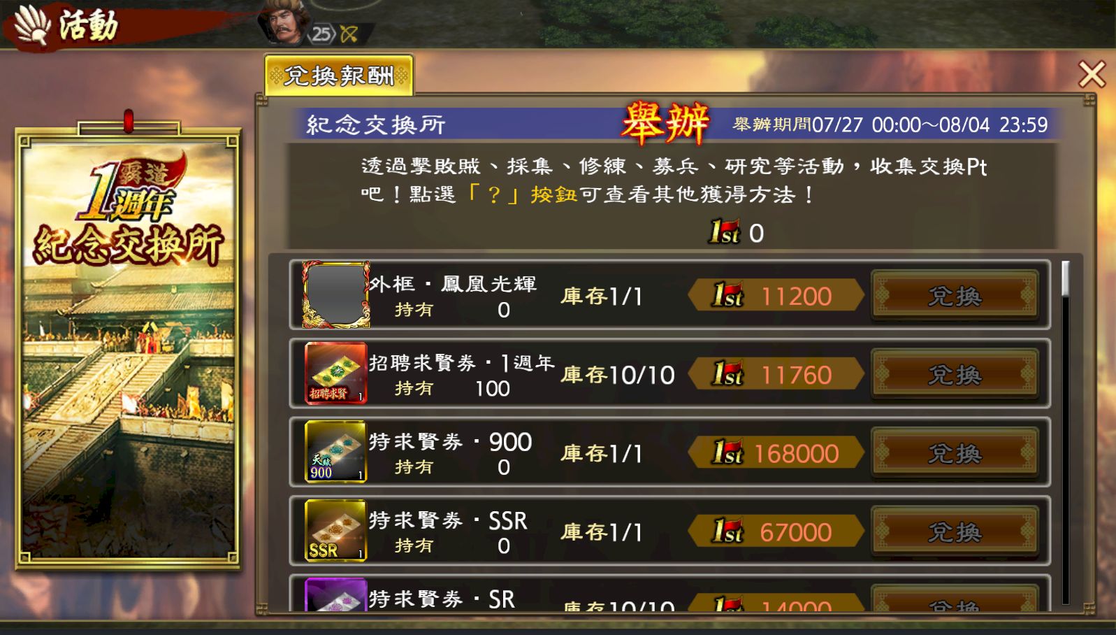 為歡慶週年慶,《三國志 霸道》也推出了多檔活動,包含「TVCM 紀念登入獎勵」,玩家只要於活動舉辦期間內每天登入即可領取最多 100 張「1 週年紀念特別求賢券」,即可免費獲得強力 UR 武將,也推出了「1 週年紀念交換所」與「名士引薦人來訪」活動。