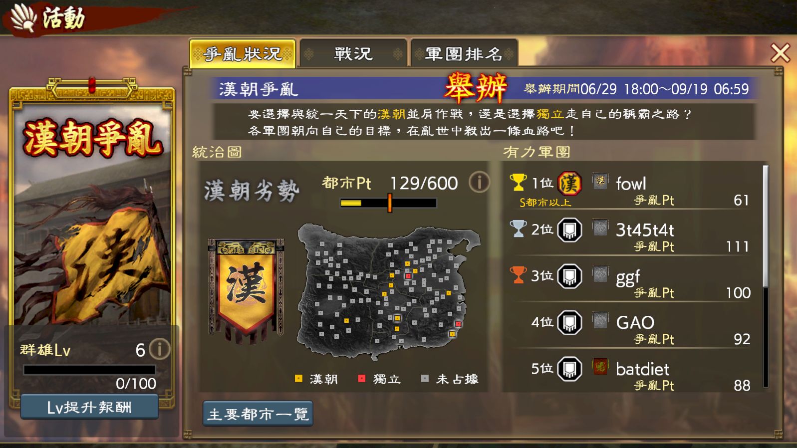 而此次改版也推出新賽季活動【漢朝爭亂】,到 2022/09/19 為止,玩家將以軍團為單位化身漢朝的主公,共同面對實力堅強的獨立軍團陣營,於中原大地中佔領最多都市獲取獎勵。最後,除了推出最新武將與活動之外,此次改版也最佳化了軍團相關功能。