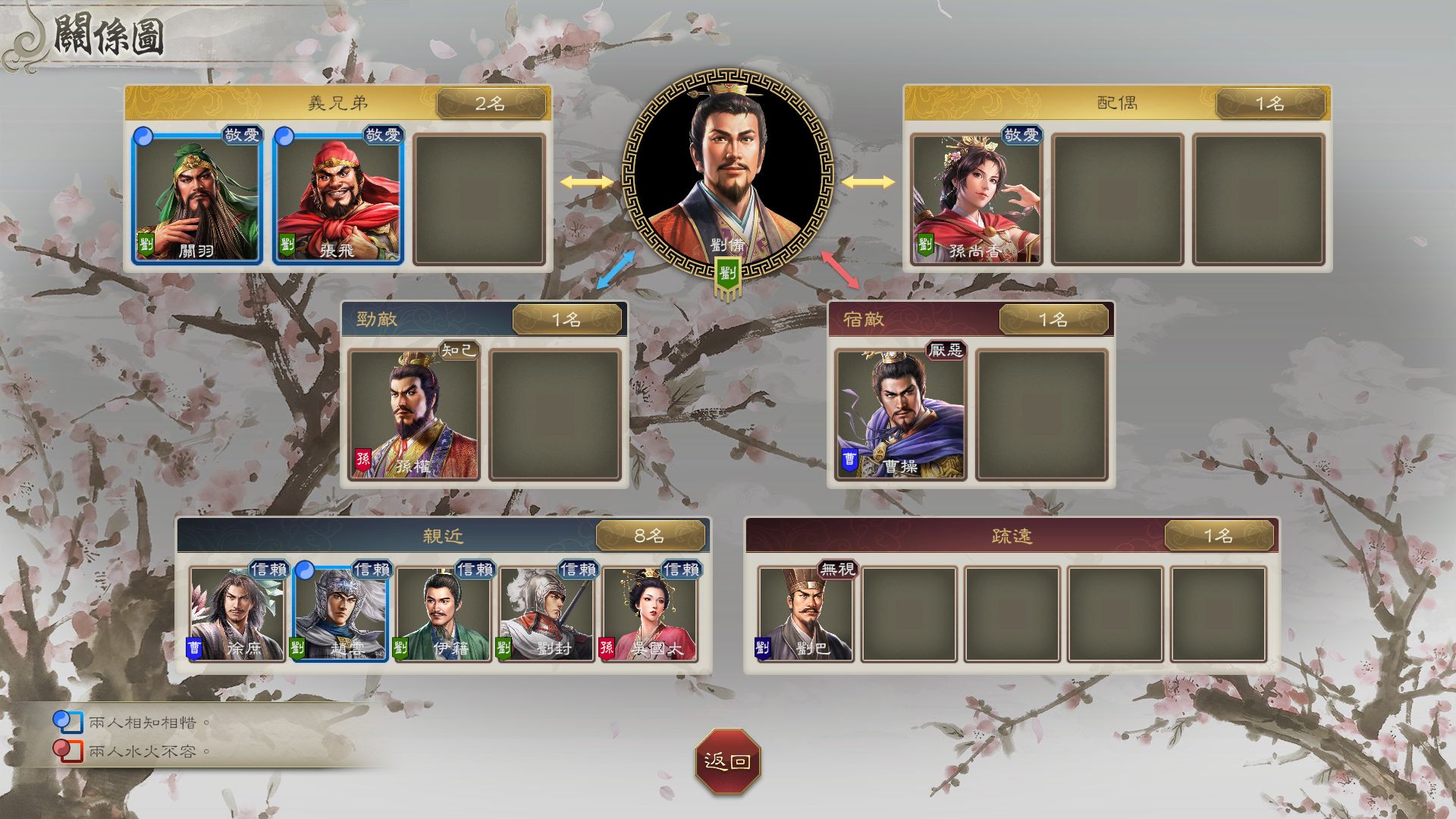 新要素「關係圖」可透過視覺圖像化的方式,讓玩家可以一目了然所扮演的武將的人際關係及「宿命」關係。除了可以確定義兄弟及配偶之外,也能確認勁敵及關係友好的武將,讓玩家可以透過直觀的方式掌握與玩家扮演的武將之人生有深厚淵源的「宿命」對象。關係圖所描繪的人際關係不單單只是史實上的武將關係,也將隨者玩家的遊戲歷程而出現變化。