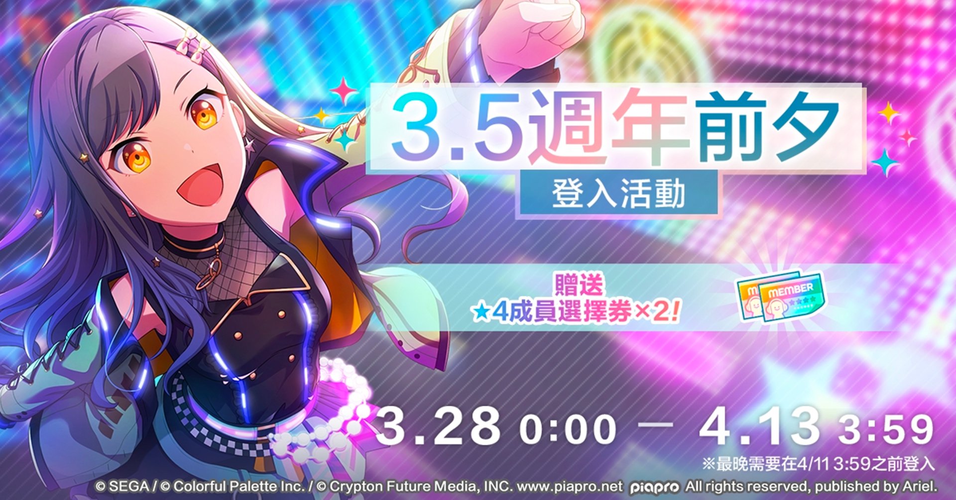 參加 3.5 週年前夕登入活動,登入即可獲得最多 2 張「★4 成員選擇券」,自由挑選心儀的超稀有角色。此外,3.5 週年紀念登入活動期間內連續 7 天免費 10 連抽,總計最多可獲得 70 次招募機會。