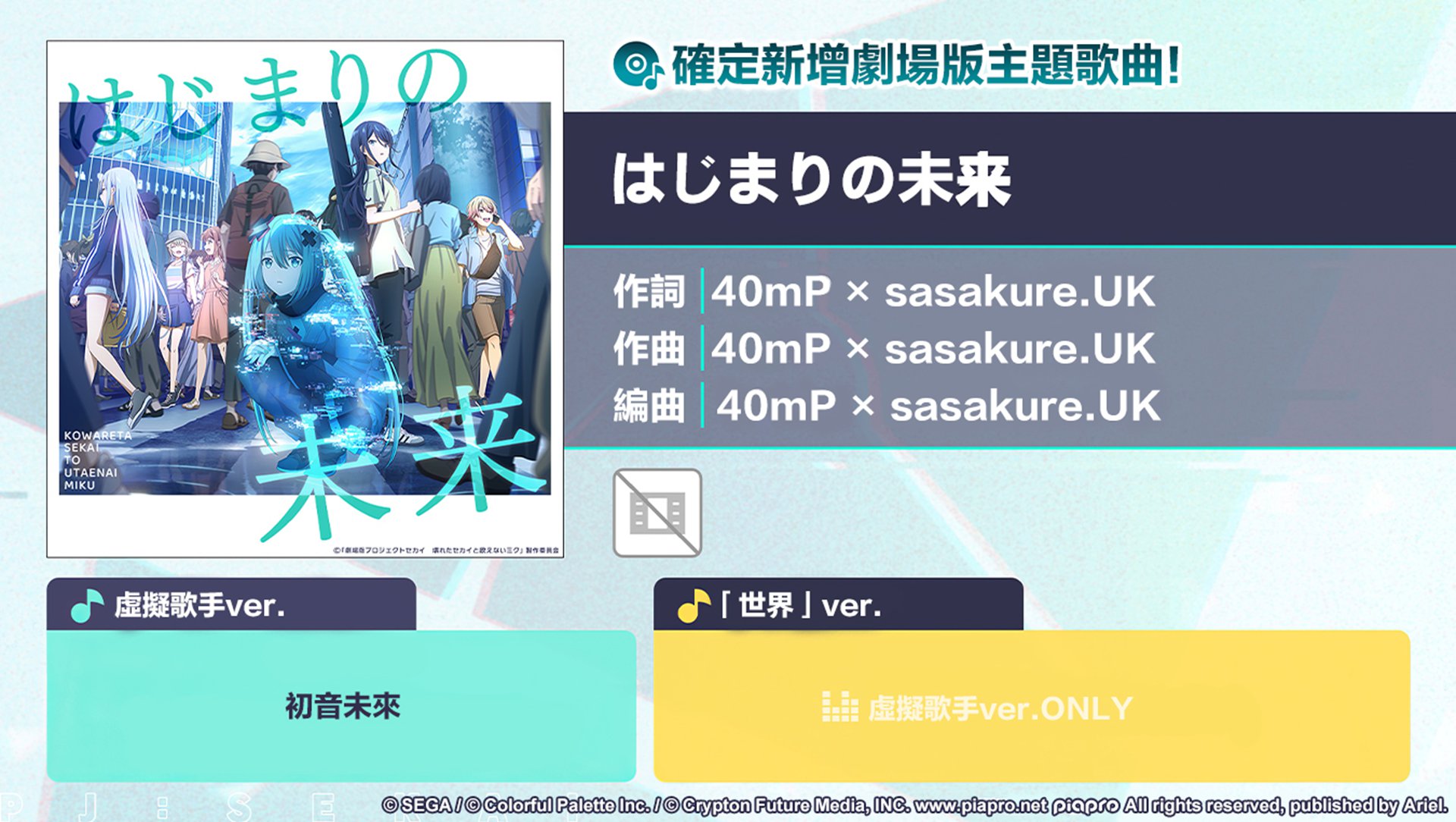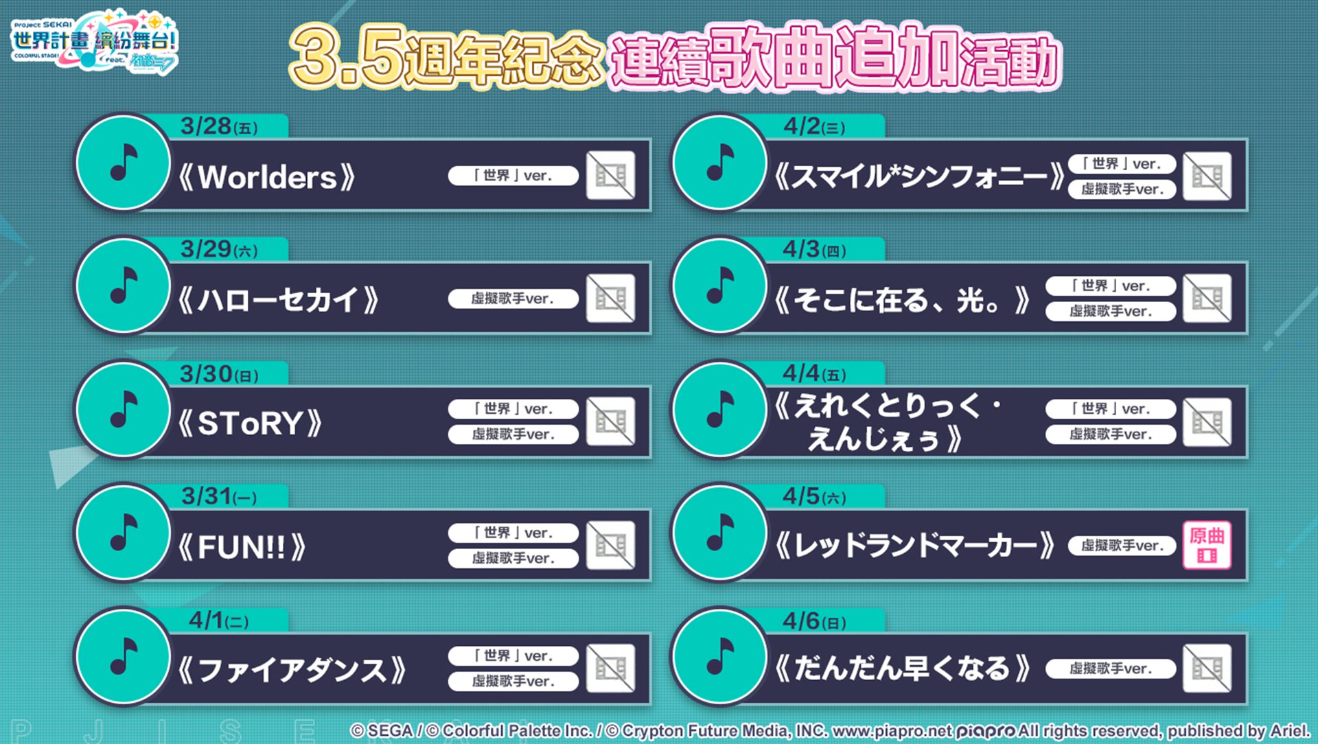 3/21 15:00 起,劇場版片頭主題歌曲《はじまりの未来》提前加入遊戲。3/28 15:00 起舉辦「3.5 週年連續歌曲追加活動」,活動期間將連續 10 天每天追加至少一首歌曲,其中包含《劇場版 世界計畫》收錄曲目。