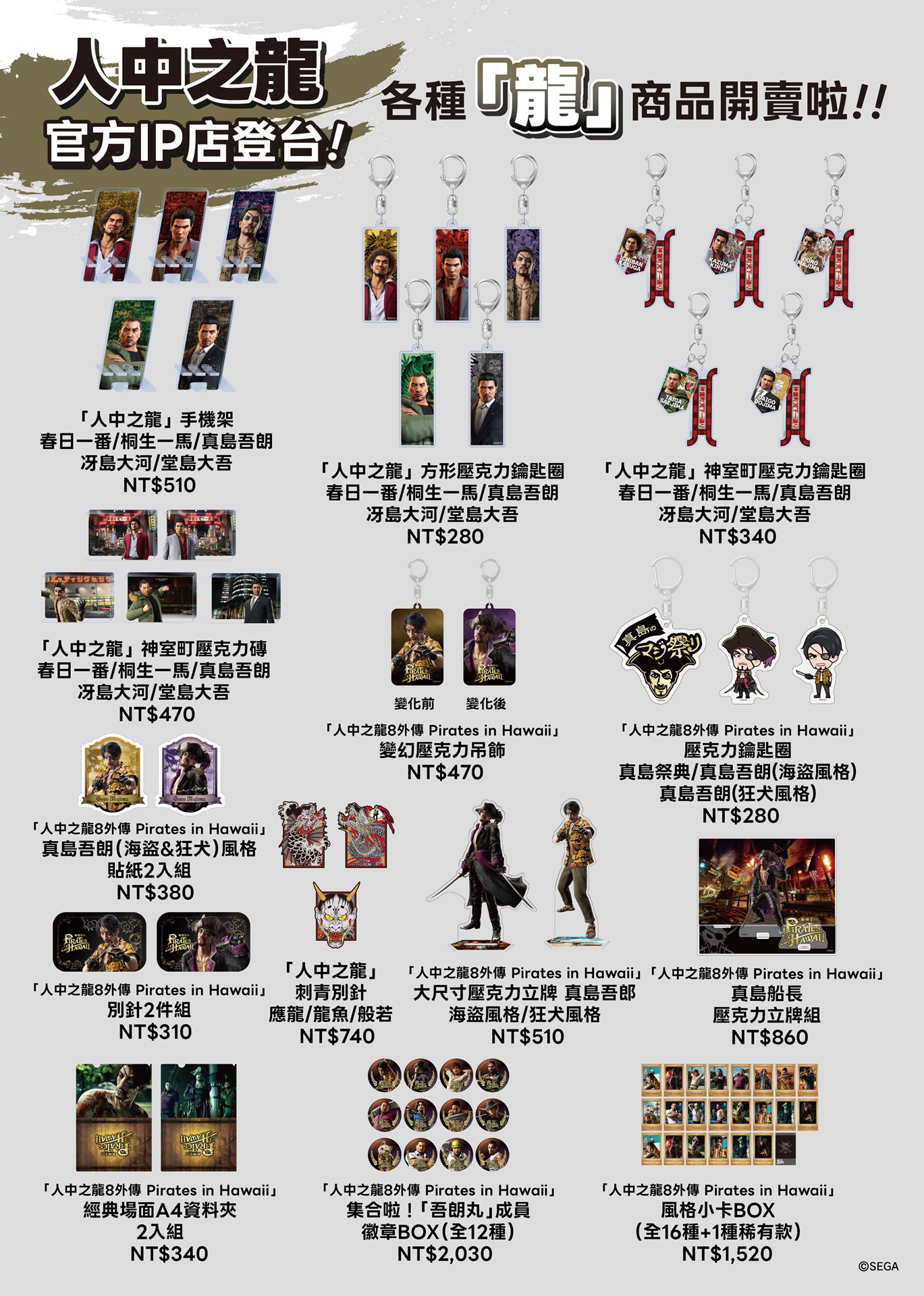 SEGA 宣布自 2025 年 8 月 29 日起,消費者可以在桃園的實體店鋪以及 SEGA Taiwan 的網路商店購買到《人中之龍》系列相關商品。這次引進的周邊商品除了充滿角色個性的衣物及飾品外也有許多最新作的作品周邊。