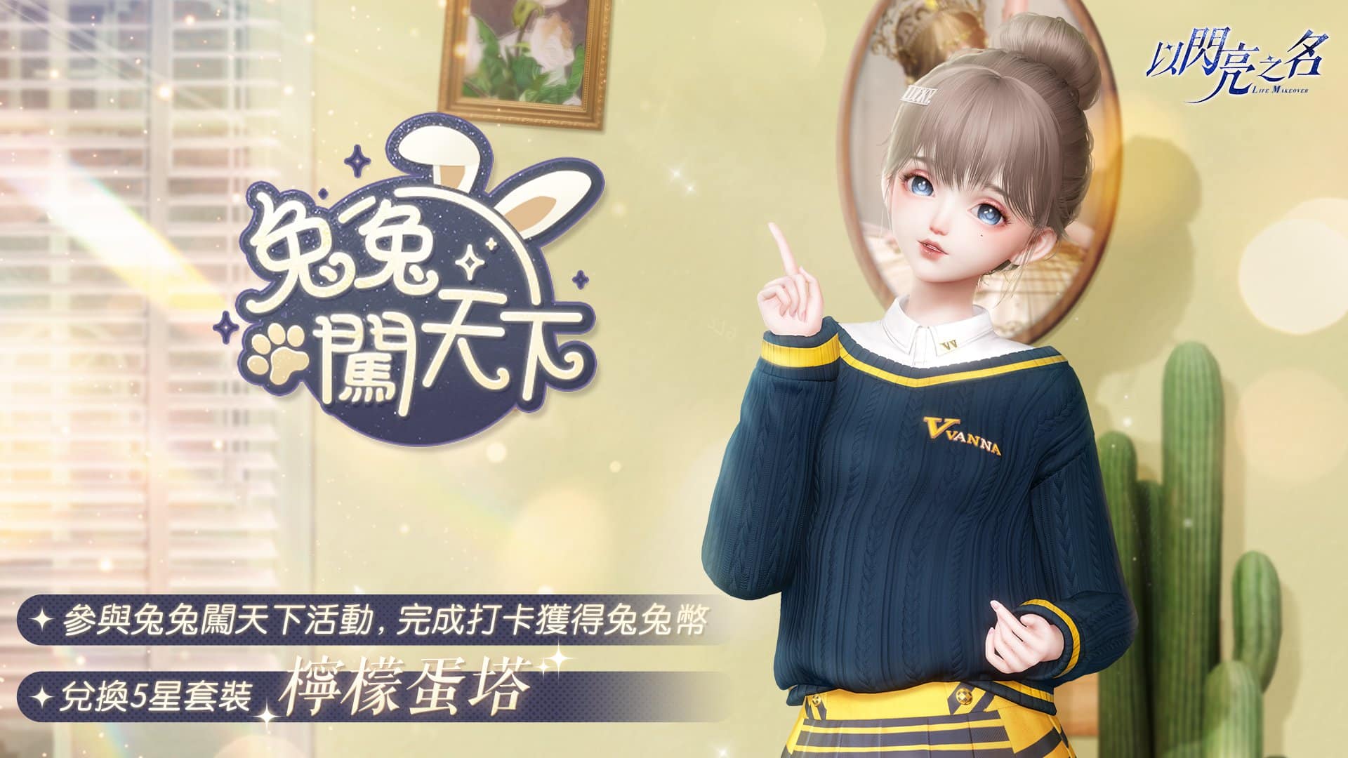 晴朗之日,兔兔決定再次勇闖天下,為合夥人帶回更多絕佳流行創意。參與日程活動可獲得闖蕩次數,出行前需要購買食物和日用品放入行囊,兔兔會根據行囊選擇出行地點,總共有 24 種景點任牠遊覽,打卡景點的距離越遠,帶回來的兔兔幣和旅行基金也會更加豐富。此外更包含 3 個特別景點,打卡之後能獲得意外驚喜。累積兔兔幣,獲取五星【檸檬蛋撻】套裝、【天燈祈願】拍照特效、【萌寵派對】拍照萌拍、鑽石,為探索閃亮世界豐富行囊。
